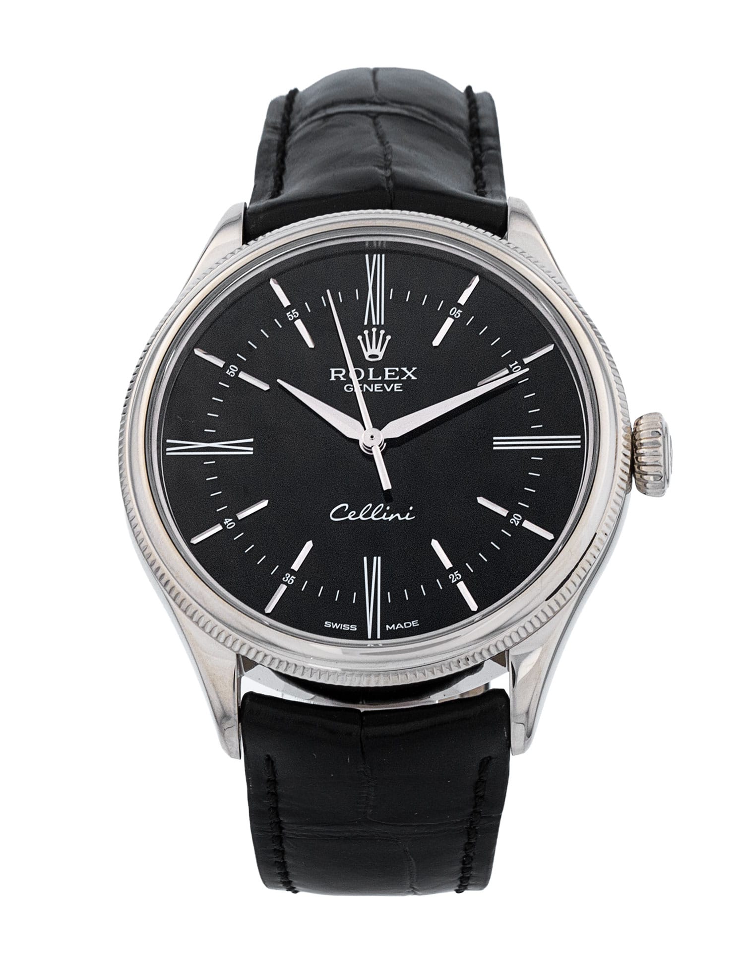 This Rolex Cellini 50509 has a black quarter roman numeral dial and a leather strap. This Rolex has undergone a thorough inspection of water resistance, accuracy, functionality and condition to determine the level of reconditioning required to meet our strict standards. It has also been referenced against technical documents and manufacturer records where available to ensure authenticity and a clean history. All our watches have a 24-month warranty for your peace of mind. One of our skilled polishing technicians has removed marks on the case and bracelet of this watch, brought about by daily wear and tear, which is why this watch does not come with the remaining manufacturer’s warranty.