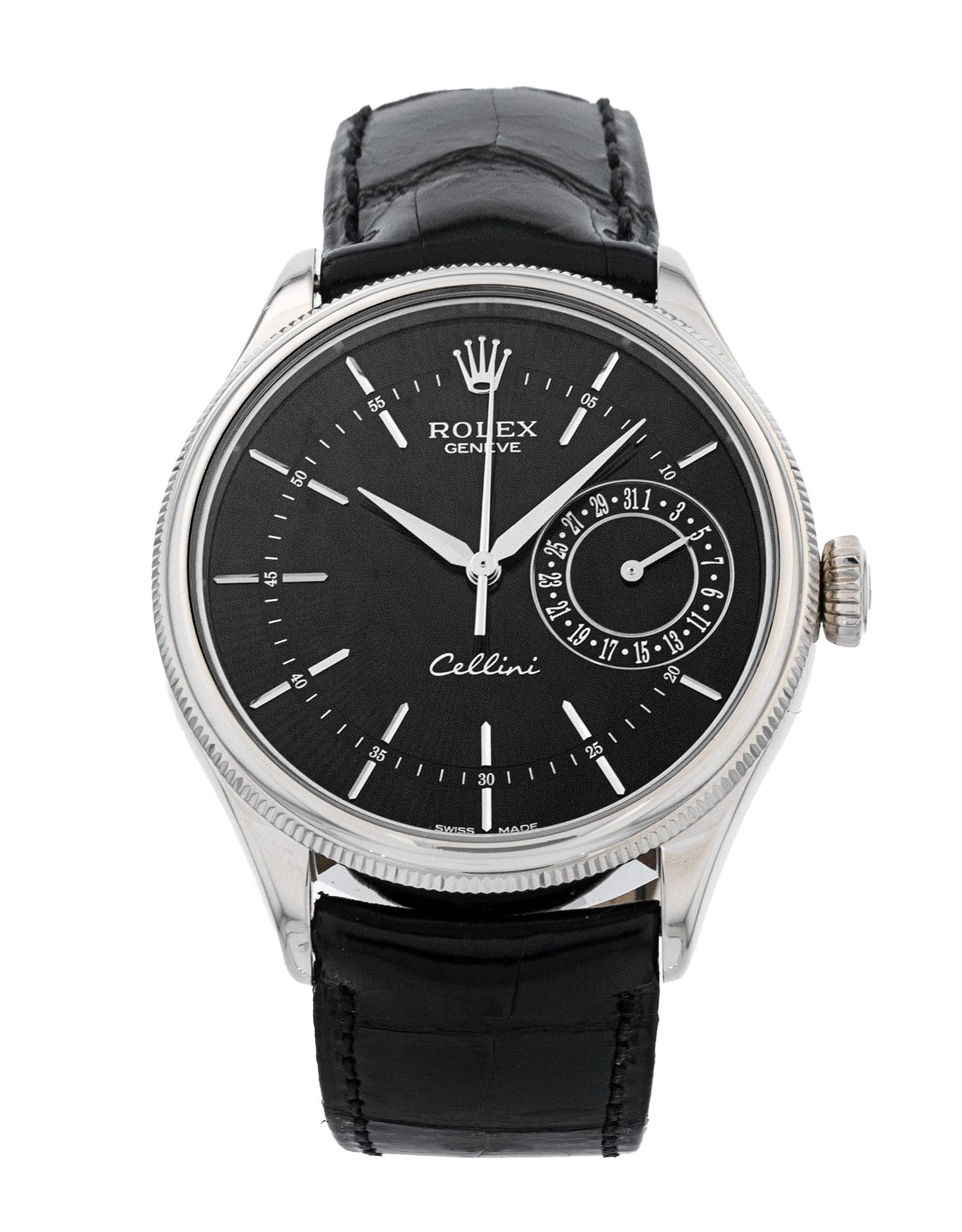 This Rolex Cellini 50519 has a black baton dial and a leather strap. This Rolex has undergone a thorough inspection of water resistance, accuracy, functionality and condition to determine the level of reconditioning required to meet our strict standards. It has also been referenced against technical documents and manufacturer records where available to ensure authenticity and a clean history. All our watches have a 24-month warranty for your peace of mind. One of our skilled polishing technicians has removed marks on the case and bracelet of this watch, brought about by daily wear and tear, which is why this watch does not come with the remaining manufacturer’s warranty.