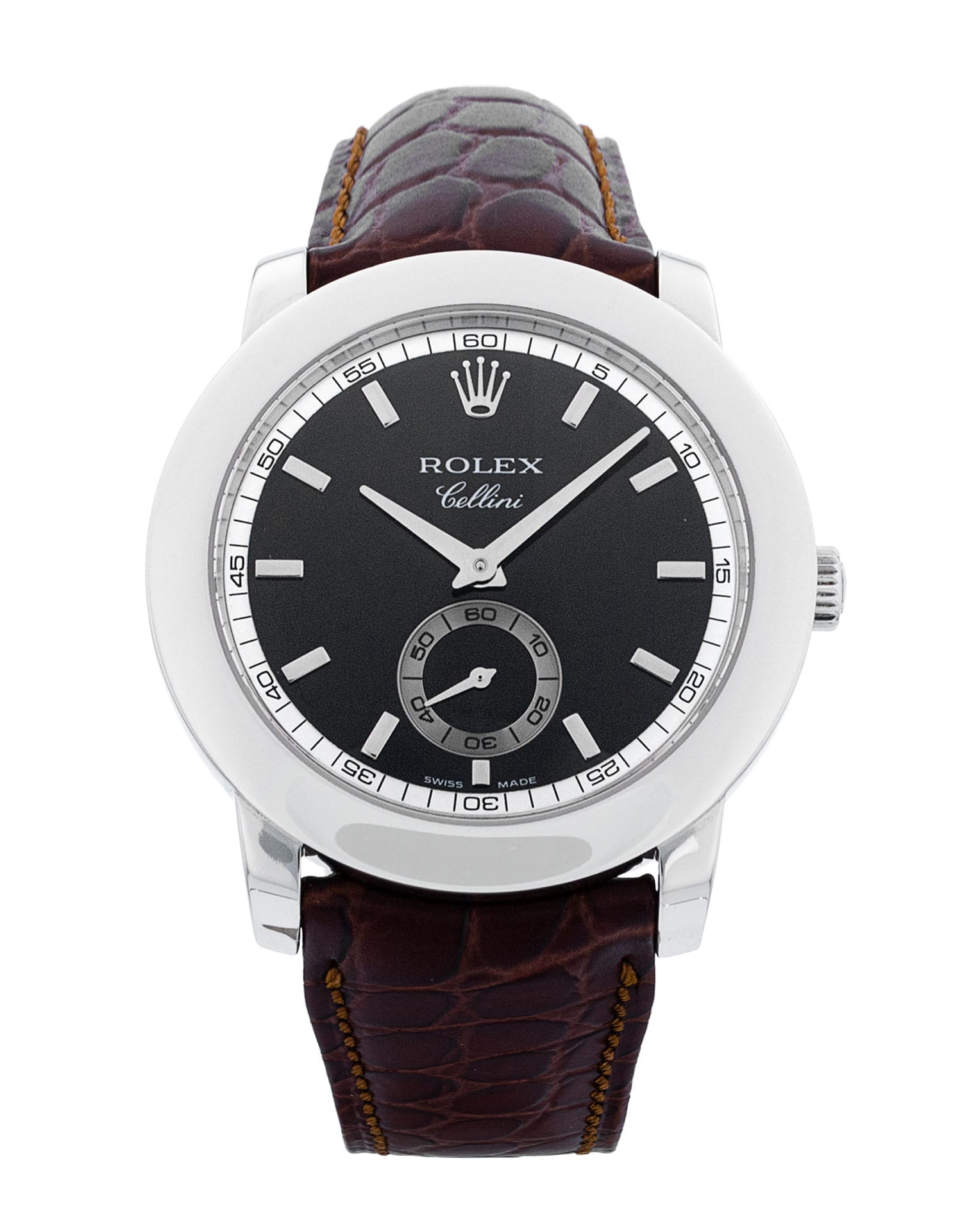 This Rolex Cellini 5241/6 has a black baton dial and a leather strap. This Rolex has undergone a thorough inspection of accuracy, functionality and condition to determine the level of reconditioning required to meet our strict standards. It has also been referenced against technical documents and manufacturer records where available to ensure authenticity and a clean history. All our watches have a 24-month warranty for your peace of mind. One of our skilled polishing technicians has removed marks on the case and bracelet of this watch, brought about by daily wear and tear, which is why this watch does not come with the remaining manufacturer’s warranty.