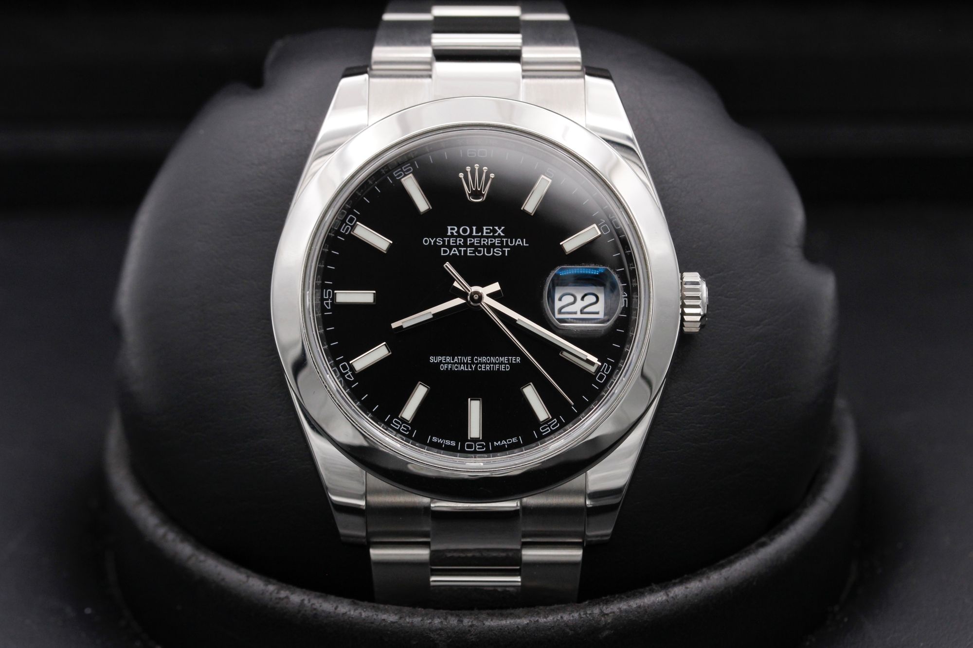 This Rolex Datejust 41 126300 has a black baton dial and a bracelet strap. This Rolex has undergone a thorough inspection of water resistance, accuracy, functionality and condition to determine the level of reconditioning required to meet our strict standards. It has also been referenced against technical documents and manufacturer records where available to ensure authenticity and a clean history. All our watches have a 24-month warranty for your peace of mind. One of our skilled polishing technicians has removed marks on the case and bracelet of this watch, brought about by daily wear and tear, which is why this watch does not come with the remaining manufacturer’s warranty.