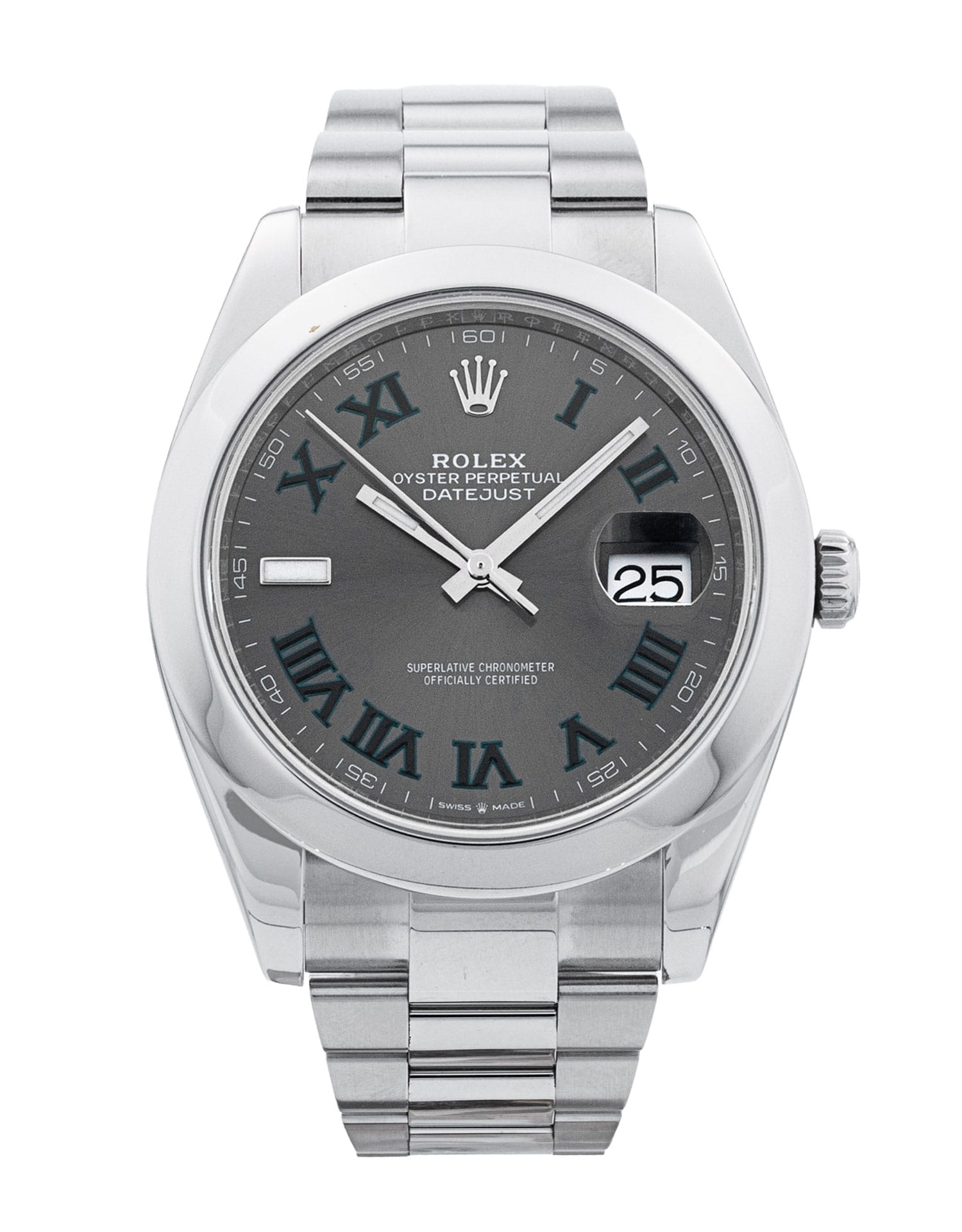 This Rolex Datejust 41 126300 has a slate roman numeral dial and a bracelet strap. This Rolex has undergone a thorough inspection of water resistance, accuracy, functionality and condition to determine the level of reconditioning required to meet our strict standards. It has also been referenced against technical documents and manufacturer records where available to ensure authenticity and a clean history. Our watches have a 24-month warranty for your peace of mind, in conjunction with any remaining manufacturer’s warranty from new or from service. To maintain the manufacturer’s warranty on this watch, it has not been polished in our service centre.