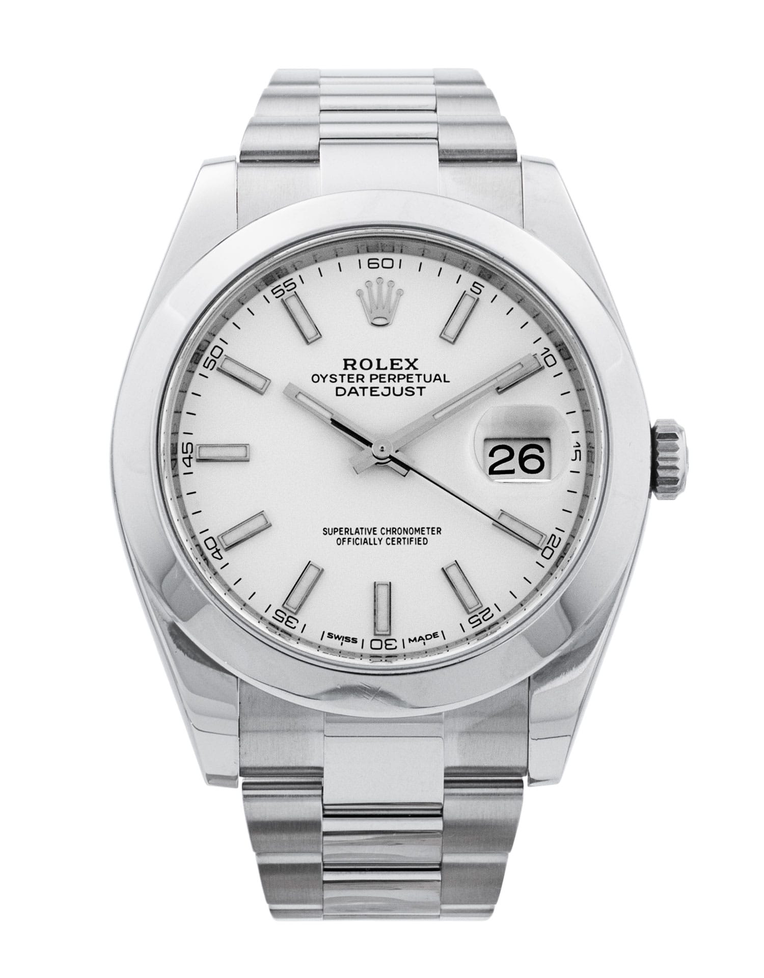This Rolex Datejust 41 126300 has a white baton dial and a bracelet strap. This Rolex has undergone a thorough inspection of water resistance, accuracy, functionality and condition to determine the level of reconditioning required to meet our strict standards. It has also been referenced against technical documents and manufacturer records where available to ensure authenticity and a clean history. All our watches have a 24-month warranty for your peace of mind. One of our skilled polishing technicians has removed marks on the case and bracelet of this watch, brought about by daily wear and tear, which is why this watch does not come with the remaining manufacturer’s warranty.