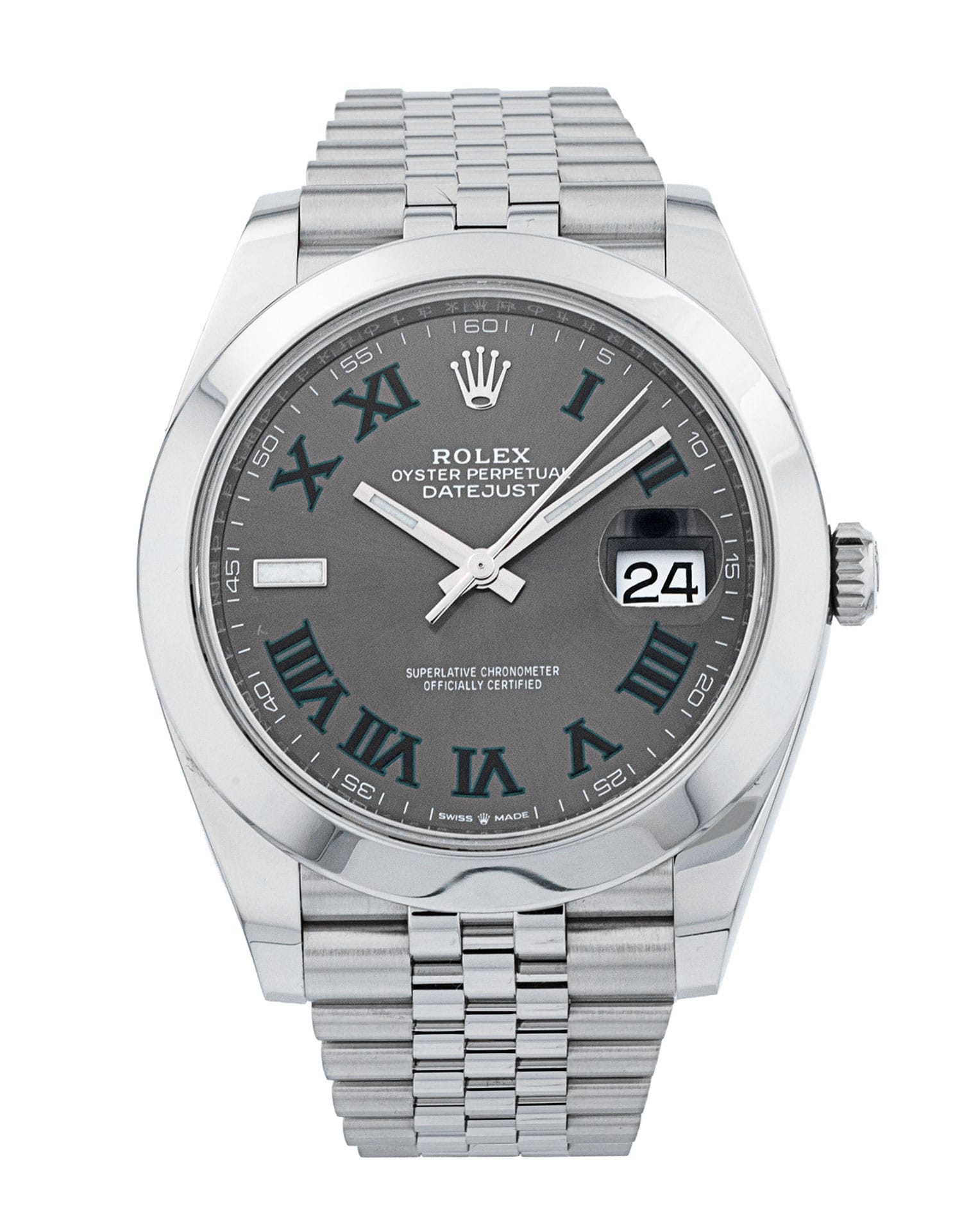 This Rolex Datejust 41 126300 has a slate roman numeral dial and a bracelet strap. This Rolex has undergone a thorough inspection of water resistance, accuracy, functionality and condition to determine the level of reconditioning required to meet our strict standards. It has also been referenced against technical documents and manufacturer records where available to ensure authenticity and a clean history. Our watches have a 24-month warranty for your peace of mind, in conjunction with any remaining manufacturer’s warranty from new or from service. To maintain the manufacturer’s warranty on this watch, it has not been polished in our service centre.