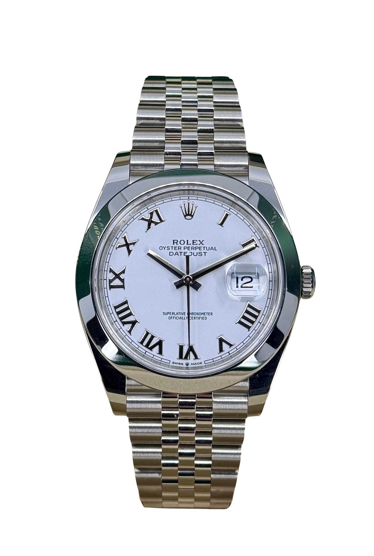 This Rolex Datejust 41 126300 has a white roman numeral dial and a bracelet strap. This Rolex has undergone a thorough inspection of water resistance, accuracy, functionality and condition to determine the level of reconditioning required to meet our strict standards. It has also been referenced against technical documents and manufacturer records where available to ensure authenticity and a clean history. Our watches have a 24-month warranty for your peace of mind, in conjunction with any remaining manufacturer’s warranty from new or from service. To maintain the manufacturer’s warranty on this watch, it has not been polished in our service centre.
