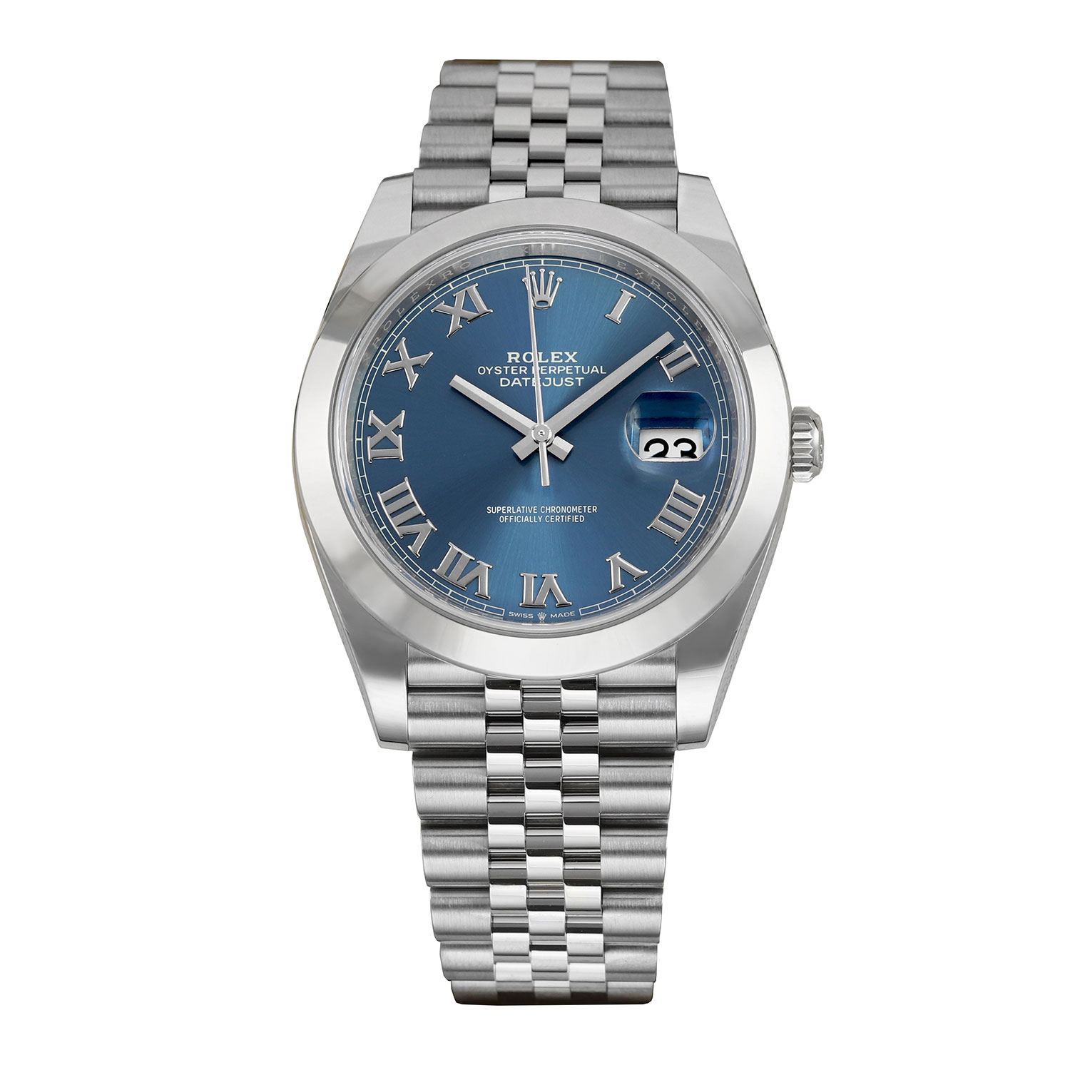 This Rolex Datejust 41 126300 has a blue roman numeral dial and a bracelet strap. This Rolex has undergone a thorough inspection of water resistance, accuracy, functionality and condition to determine the level of reconditioning required to meet our strict standards. It has also been referenced against technical documents and manufacturer records where available to ensure authenticity and a clean history. Our watches have a 24-month warranty for your peace of mind, in conjunction with any remaining manufacturer’s warranty from new or from service. To maintain the manufacturer’s warranty on this watch, it has not been polished in our service centre.