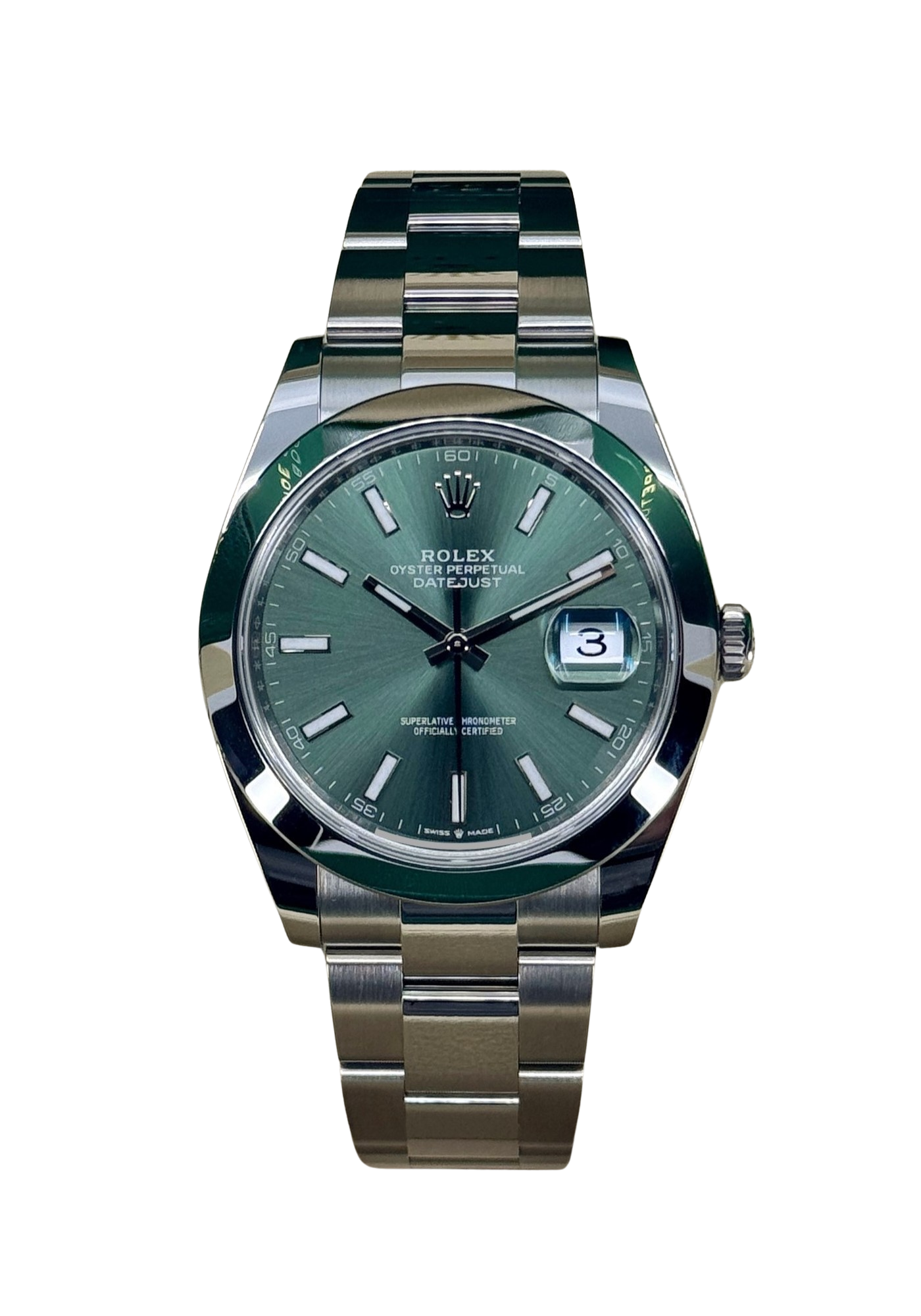 This Rolex Datejust 41 126300 has a mint green baton dial and a bracelet strap. This Rolex has undergone a thorough inspection of water resistance, accuracy, functionality and condition to determine the level of reconditioning required to meet our strict standards. It has also been referenced against technical documents and manufacturer records where available to ensure authenticity and a clean history. Our watches have a 24-month warranty for your peace of mind, in conjunction with any remaining manufacturer’s warranty from new or from service. To maintain the manufacturer’s warranty on this watch, it has not been polished in our service centre.
