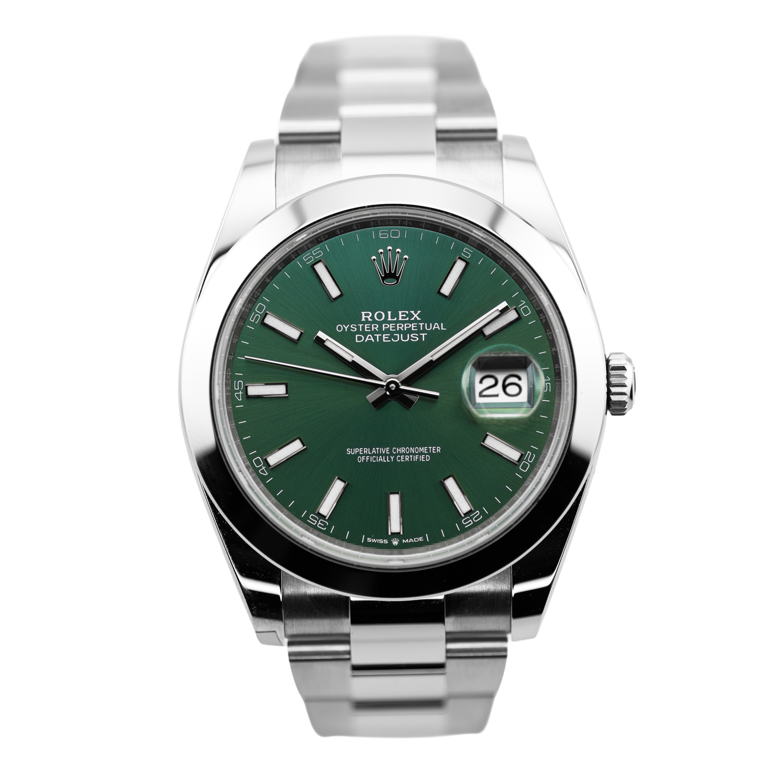This Rolex Datejust 41 126300 has a mint green baton dial and a bracelet strap. This Rolex has undergone a thorough inspection of water resistance, accuracy, functionality and condition to determine the level of reconditioning required to meet our strict standards. It has also been referenced against technical documents and manufacturer records where available to ensure authenticity and a clean history. Our watches have a 24-month warranty for your peace of mind, in conjunction with any remaining manufacturer’s warranty from new or from service. To maintain the manufacturer’s warranty on this watch, it has not been polished in our service centre.