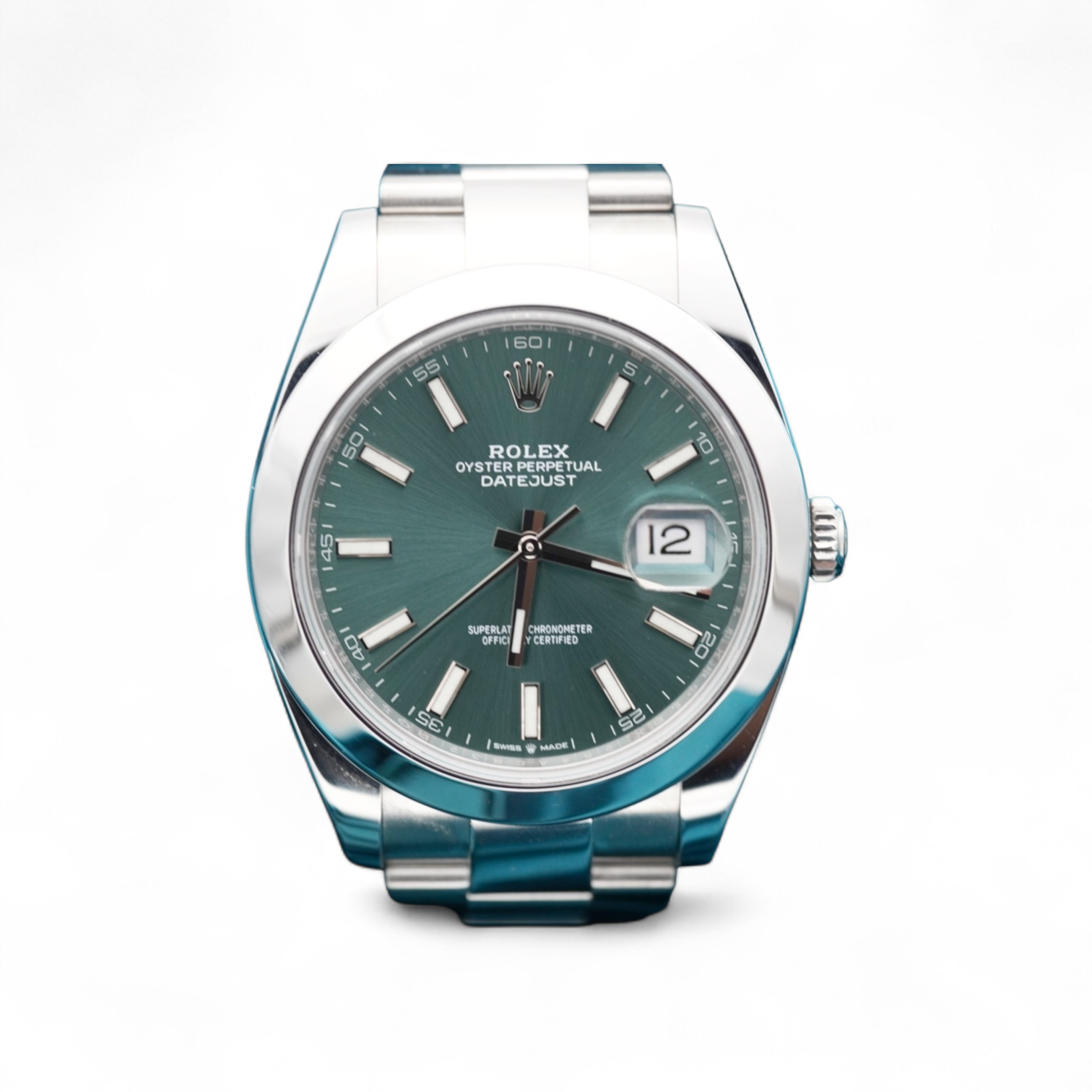 This Rolex Datejust 41 126300 has a mint green baton dial and a bracelet strap. This Rolex has undergone a thorough inspection of water resistance, accuracy, functionality and condition to determine the level of reconditioning required to meet our strict standards. It has also been referenced against technical documents and manufacturer records where available to ensure authenticity and a clean history. Our watches have a 24-month warranty for your peace of mind, in conjunction with any remaining manufacturer’s warranty from new or from service. To maintain the manufacturer’s warranty on this watch, it has not been polished in our service centre.