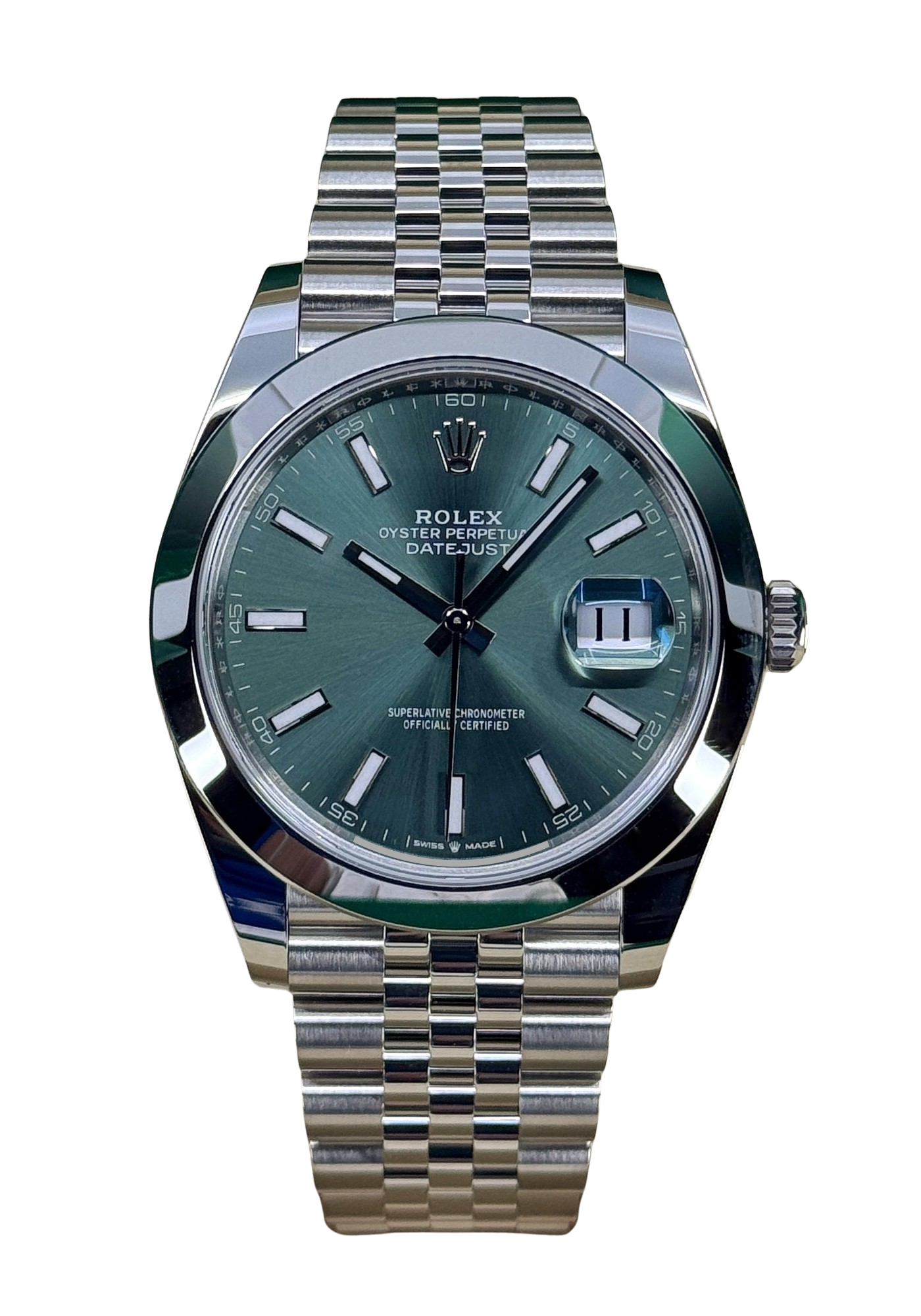 This Rolex Datejust 41 126300 has a mint green baton dial and a bracelet strap. This Rolex has undergone a thorough inspection of water resistance, accuracy, functionality and condition to determine the level of reconditioning required to meet our strict standards. It has also been referenced against technical documents and manufacturer records where available to ensure authenticity and a clean history. Our watches have a 24-month warranty for your peace of mind, in conjunction with any remaining manufacturer’s warranty from new or from service. To maintain the manufacturer’s warranty on this watch, it has not been polished in our service centre.