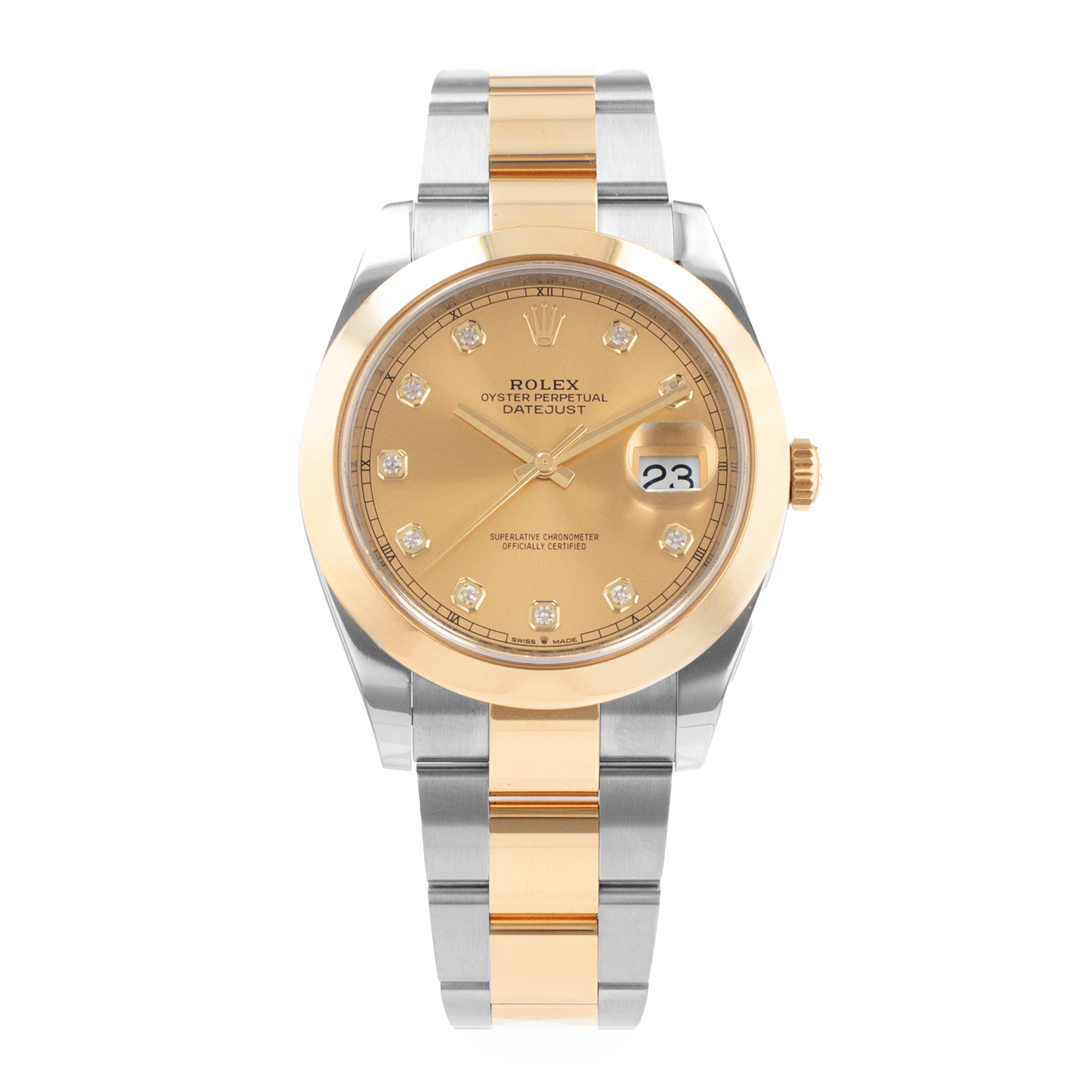 This Rolex Datejust 41 126303 has a champagne diamond dial and a bracelet strap. This Rolex has undergone a thorough inspection of water resistance, accuracy, functionality and condition to determine the level of reconditioning required to meet our strict standards. It has also been referenced against technical documents and manufacturer records where available to ensure authenticity and a clean history. Our watches have a 24-month warranty for your peace of mind, in conjunction with any remaining manufacturer’s warranty from new or from service. To maintain the manufacturer’s warranty on this watch, it has not been polished in our service centre.
