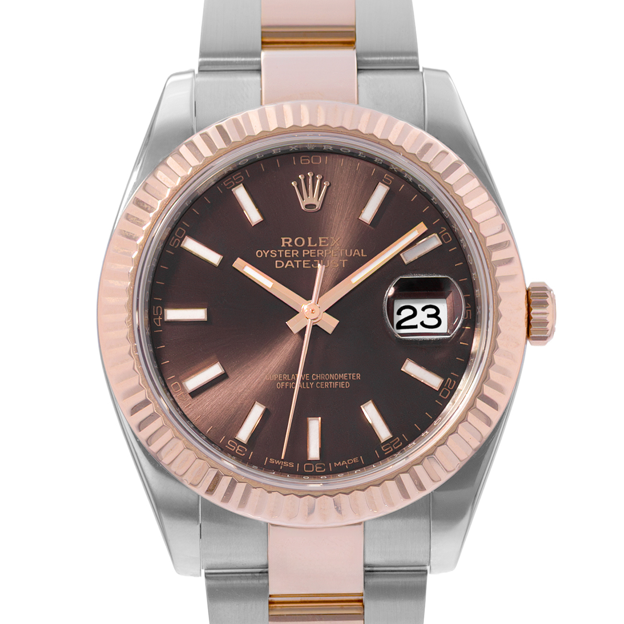 This Rolex Datejust 41 126331 has a chocolate baton dial and a bracelet strap. This Rolex has undergone a thorough inspection of water resistance, accuracy, functionality and condition to determine the level of reconditioning required to meet our strict standards. It has also been referenced against technical documents and manufacturer records where available to ensure authenticity and a clean history. All our watches have a 24-month warranty for your peace of mind. One of our skilled polishing technicians has removed marks on the case and bracelet of this watch, brought about by daily wear and tear, which is why this watch does not come with the remaining manufacturer’s warranty.