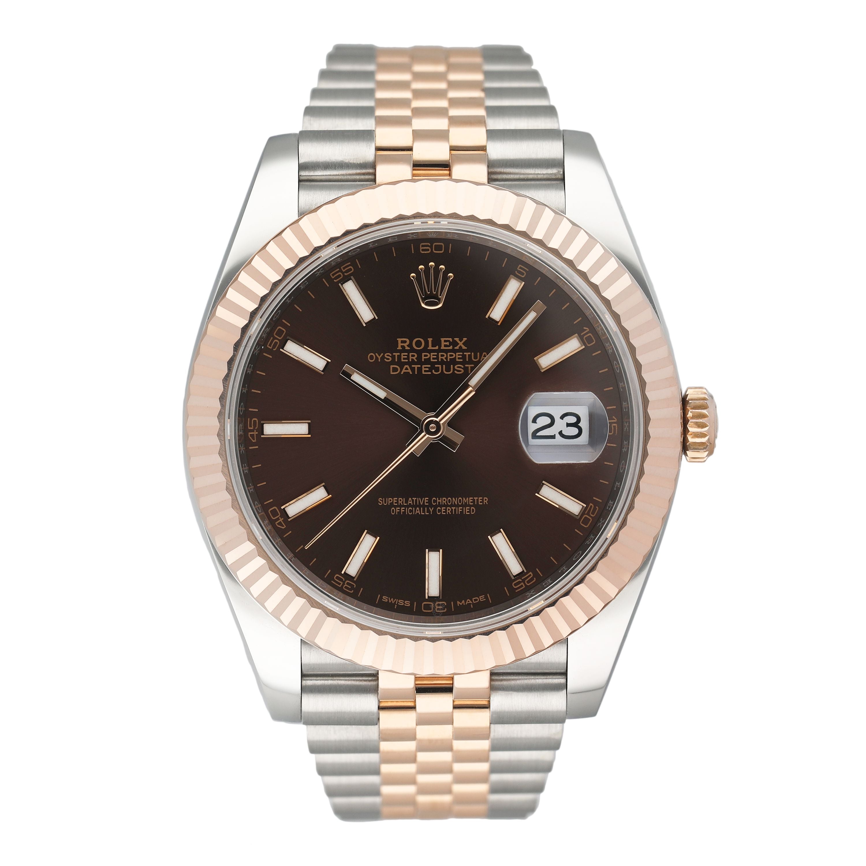 This Rolex Datejust 41 126331 has a chocolate baton dial and a bracelet strap. This Rolex has undergone a thorough inspection of water resistance, accuracy, functionality and condition to determine the level of reconditioning required to meet our strict standards. It has also been referenced against technical documents and manufacturer records where available to ensure authenticity and a clean history. All our watches have a 24-month warranty for your peace of mind. One of our skilled polishing technicians has removed marks on the case and bracelet of this watch, brought about by daily wear and tear, which is why this watch does not come with the remaining manufacturer’s warranty.
