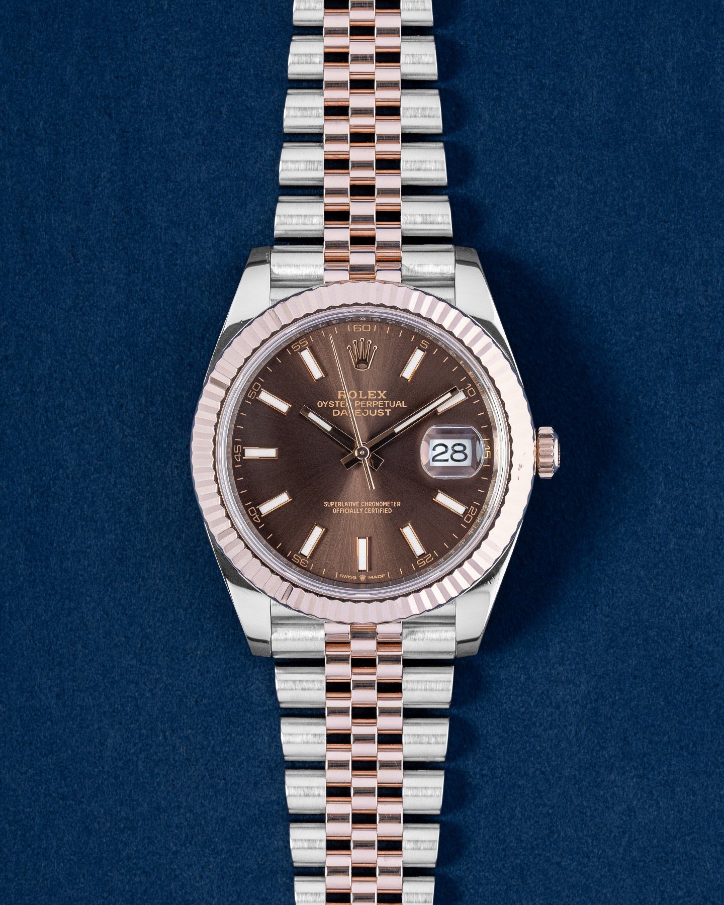 This Rolex Datejust 41 126331 has a chocolate baton dial and a bracelet strap. This Rolex has undergone a thorough inspection of water resistance, accuracy, functionality and condition to determine the level of reconditioning required to meet our strict standards. It has also been referenced against technical documents and manufacturer records where available to ensure authenticity and a clean history. Our watches have a 24-month warranty for your peace of mind, in conjunction with any remaining manufacturer’s warranty from new or from service. To maintain the manufacturer’s warranty on this watch, it has not been polished in our service centre.