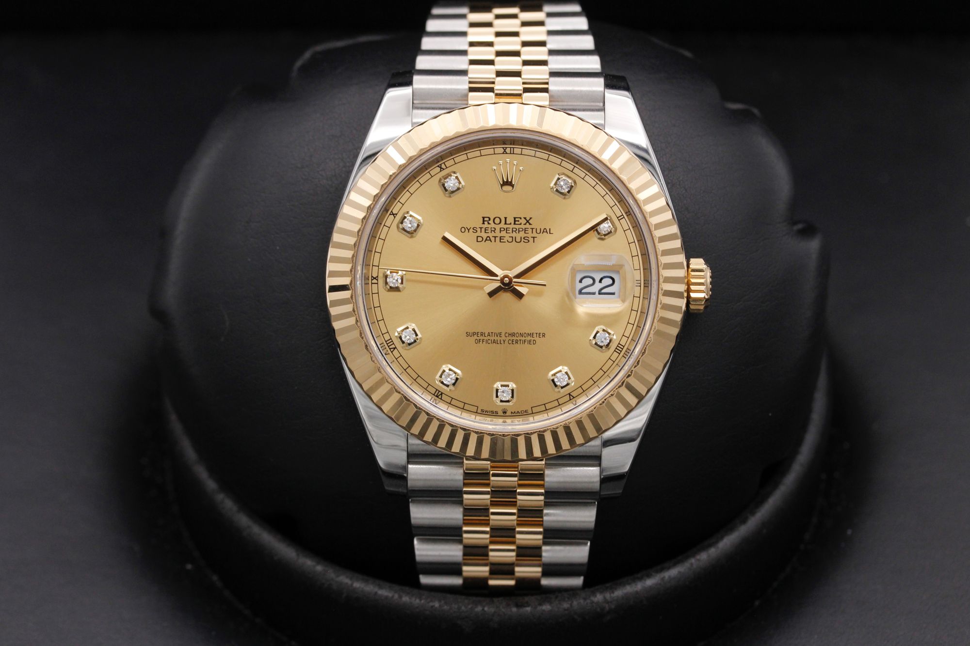 This Rolex Datejust 41 126333 has a champagne diamond dial and a bracelet strap. This Rolex has undergone a thorough inspection of water resistance, accuracy, functionality and condition to determine the level of reconditioning required to meet our strict standards. It has also been referenced against technical documents and manufacturer records where available to ensure authenticity and a clean history. All our watches have a 24-month warranty for your peace of mind. One of our skilled polishing technicians has removed marks on the case and bracelet of this watch, brought about by daily wear and tear, which is why this watch does not come with the remaining manufacturer’s warranty.