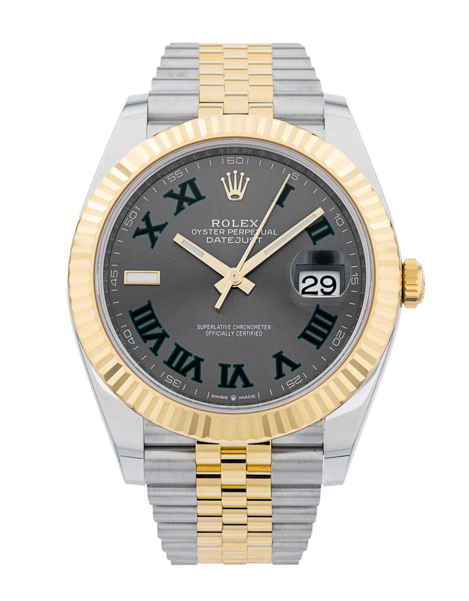 This Rolex Datejust 41 126333 has a slate roman numeral dial and a bracelet strap. This Rolex has undergone a thorough inspection of water resistance, accuracy, functionality and condition to determine the level of reconditioning required to meet our strict standards. It has also been referenced against technical documents and manufacturer records where available to ensure authenticity and a clean history. Our watches have a 24-month warranty for your peace of mind, in conjunction with any remaining manufacturer’s warranty from new or from service. To maintain the manufacturer’s warranty on this watch, it has not been polished in our service centre.