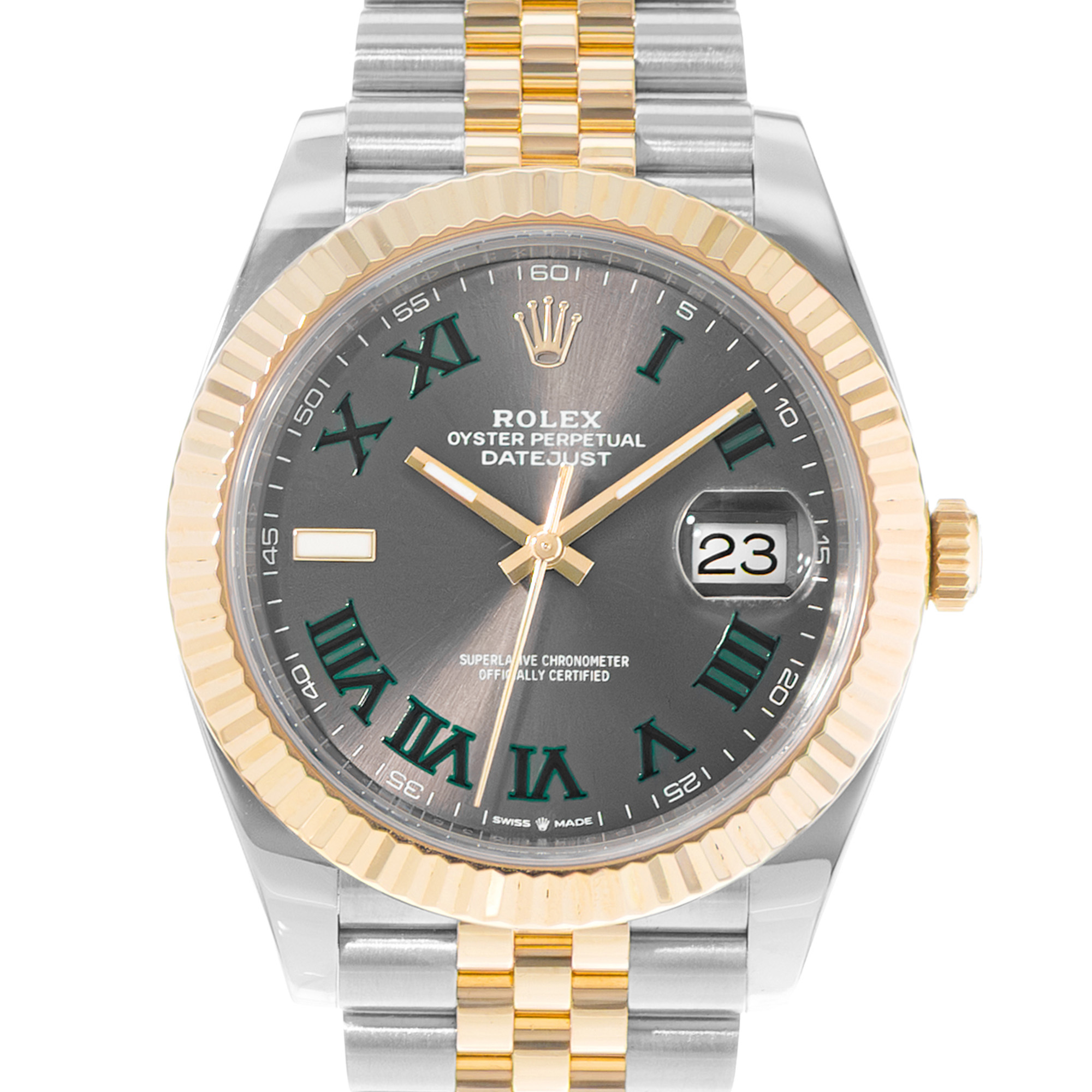This Rolex Datejust 41 126333 has a slate roman numeral dial and a bracelet strap. This Rolex has undergone a thorough inspection of water resistance, accuracy, functionality and condition to determine the level of reconditioning required to meet our strict standards. It has also been referenced against technical documents and manufacturer records where available to ensure authenticity and a clean history. All our watches have a 24-month warranty for your peace of mind. One of our skilled polishing technicians has removed marks on the case and bracelet of this watch, brought about by daily wear and tear, which is why this watch does not come with the remaining manufacturer’s warranty.
