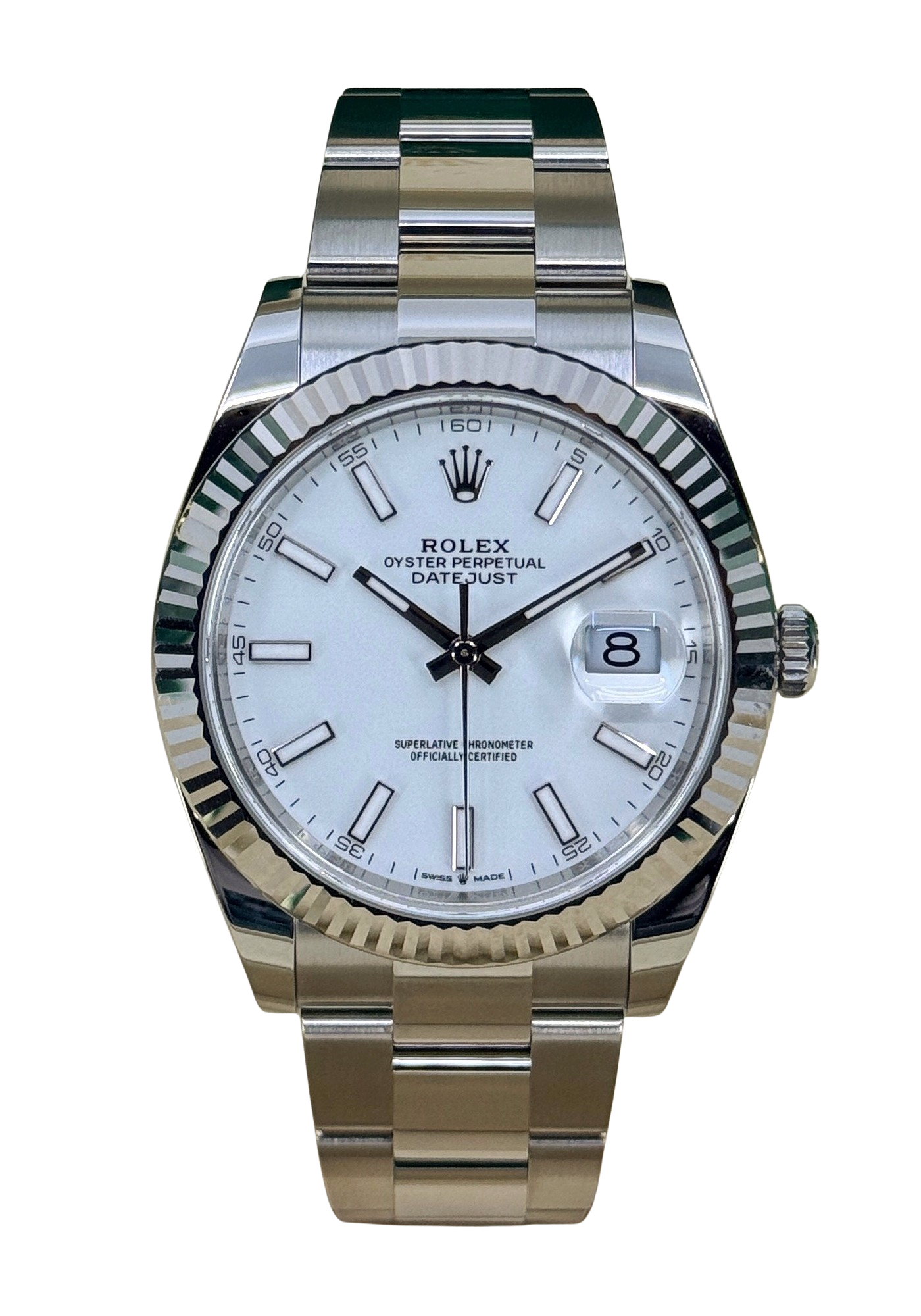 This Rolex Datejust 41 126334 has a white baton dial and a bracelet strap. This Rolex has undergone a thorough inspection of water resistance, accuracy, functionality and condition to determine the level of reconditioning required to meet our strict standards. It has also been referenced against technical documents and manufacturer records where available to ensure authenticity and a clean history. Our watches have a 24-month warranty for your peace of mind, in conjunction with any remaining manufacturer’s warranty from new or from service. To maintain the manufacturer’s warranty on this watch, it has not been polished in our service centre.