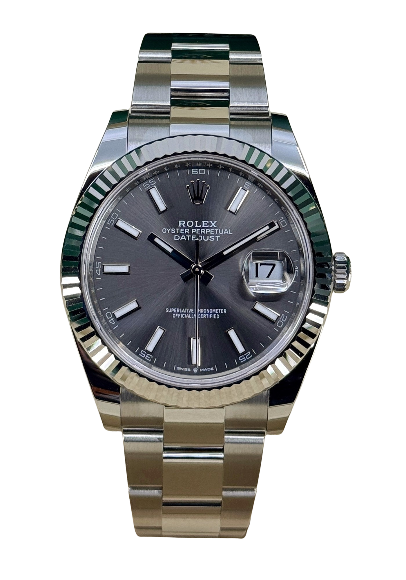 This Rolex Datejust 41 126334 has a slate baton dial and a bracelet strap. This Rolex has undergone a thorough inspection of water resistance, accuracy, functionality and condition to determine the level of reconditioning required to meet our strict standards. It has also been referenced against technical documents and manufacturer records where available to ensure authenticity and a clean history. Our watches have a 24-month warranty for your peace of mind, in conjunction with any remaining manufacturer’s warranty from new or from service. To maintain the manufacturer’s warranty on this watch, it has not been polished in our service centre.