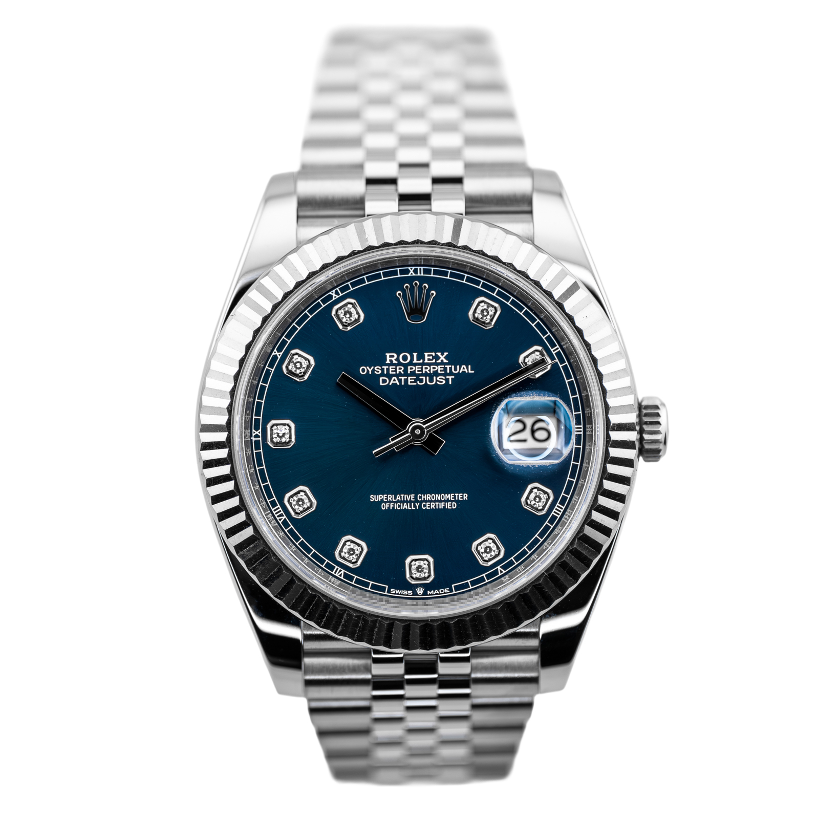 This Rolex Datejust 41 126334 has a blue diamond dial and a bracelet strap. This Rolex has undergone a thorough inspection of water resistance, accuracy, functionality and condition to determine the level of reconditioning required to meet our strict standards. It has also been referenced against technical documents and manufacturer records where available to ensure authenticity and a clean history. All our watches have a 24-month warranty for your peace of mind. One of our skilled polishing technicians has removed marks on the case and bracelet of this watch, brought about by daily wear and tear, which is why this watch does not come with the remaining manufacturer’s warranty.