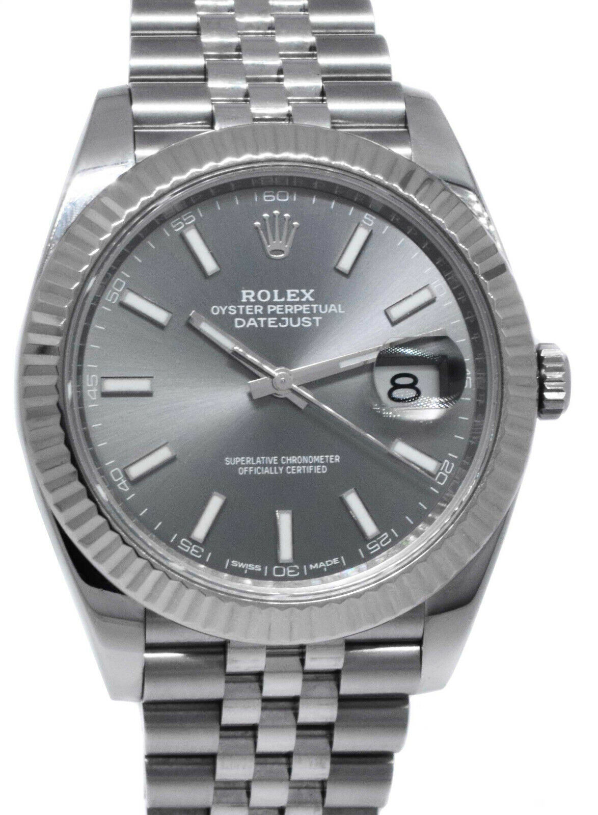 This Rolex Datejust 41 126334 has a rhodium baton dial and a bracelet strap. This Rolex has undergone a thorough inspection of water resistance, accuracy, functionality and condition to determine the level of reconditioning required to meet our strict standards. It has also been referenced against technical documents and manufacturer records where available to ensure authenticity and a clean history. All our watches have a 24-month warranty for your peace of mind. One of our skilled polishing technicians has removed marks on the case and bracelet of this watch, brought about by daily wear and tear, which is why this watch does not come with the remaining manufacturer’s warranty.