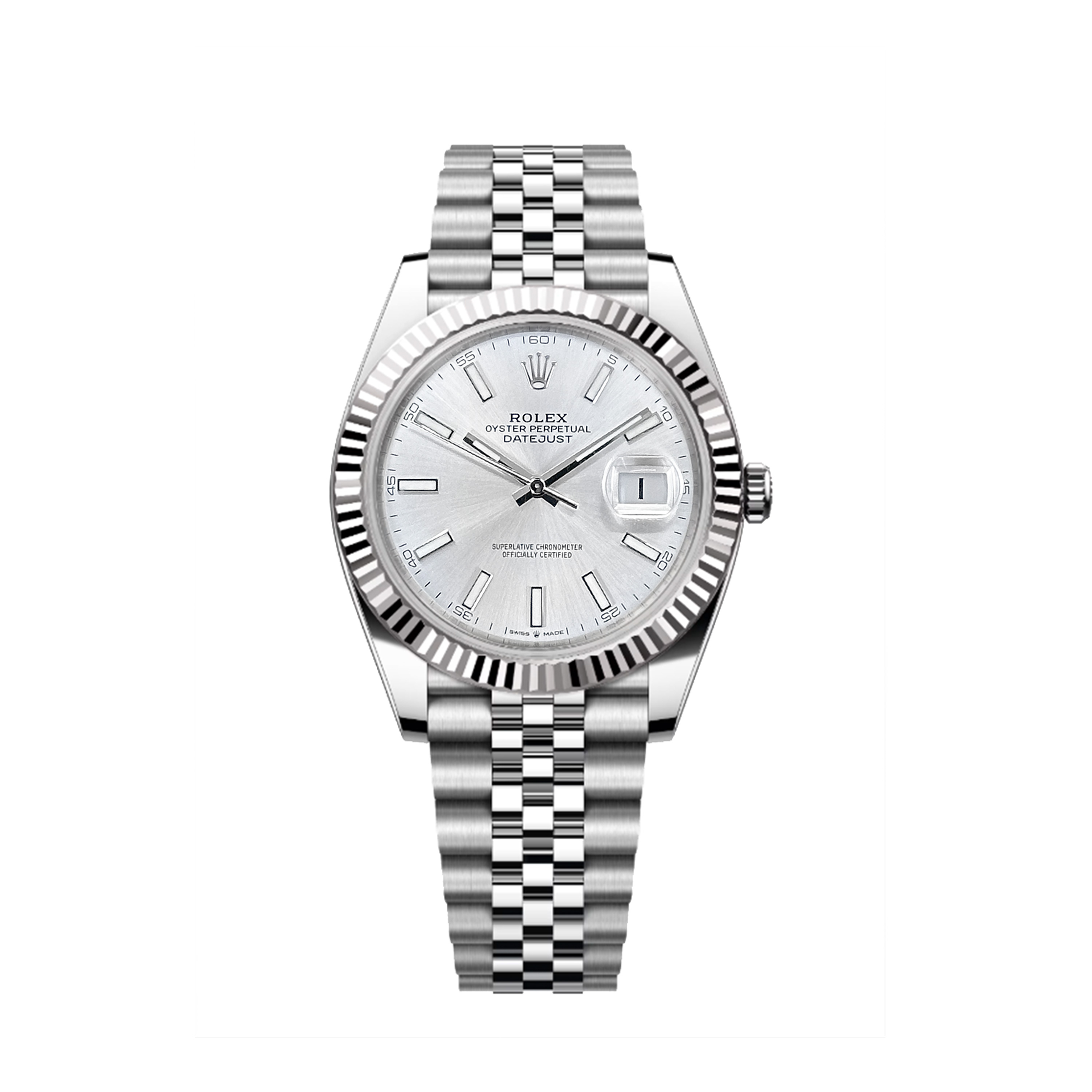 This Rolex Datejust 41 126334 has a silver baton dial and a bracelet strap. This Rolex has undergone a thorough inspection of water resistance, accuracy, functionality and condition to determine the level of reconditioning required to meet our strict standards. It has also been referenced against technical documents and manufacturer records where available to ensure authenticity and a clean history. Our watches have a 24-month warranty for your peace of mind, in conjunction with any remaining manufacturer’s warranty from new or from service. To maintain the manufacturer’s warranty on this watch, it has not been polished in our service centre.