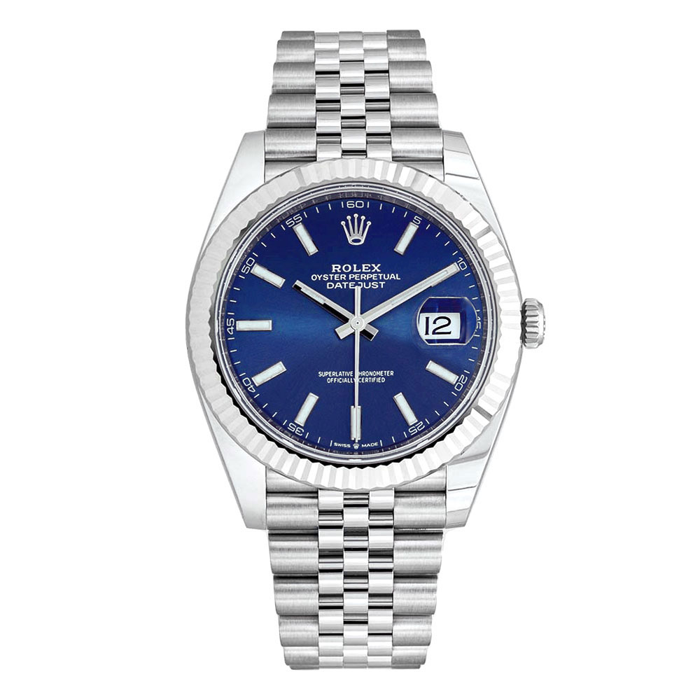 This Rolex Datejust 41 126334 has a blue baton dial and a bracelet strap. This Rolex has undergone a thorough inspection of water resistance, accuracy, functionality and condition to determine the level of reconditioning required to meet our strict standards. It has also been referenced against technical documents and manufacturer records where available to ensure authenticity and a clean history. All our watches have a 24-month warranty for your peace of mind. One of our skilled polishing technicians has removed marks on the case and bracelet of this watch, brought about by daily wear and tear, which is why this watch does not come with the remaining manufacturer’s warranty.