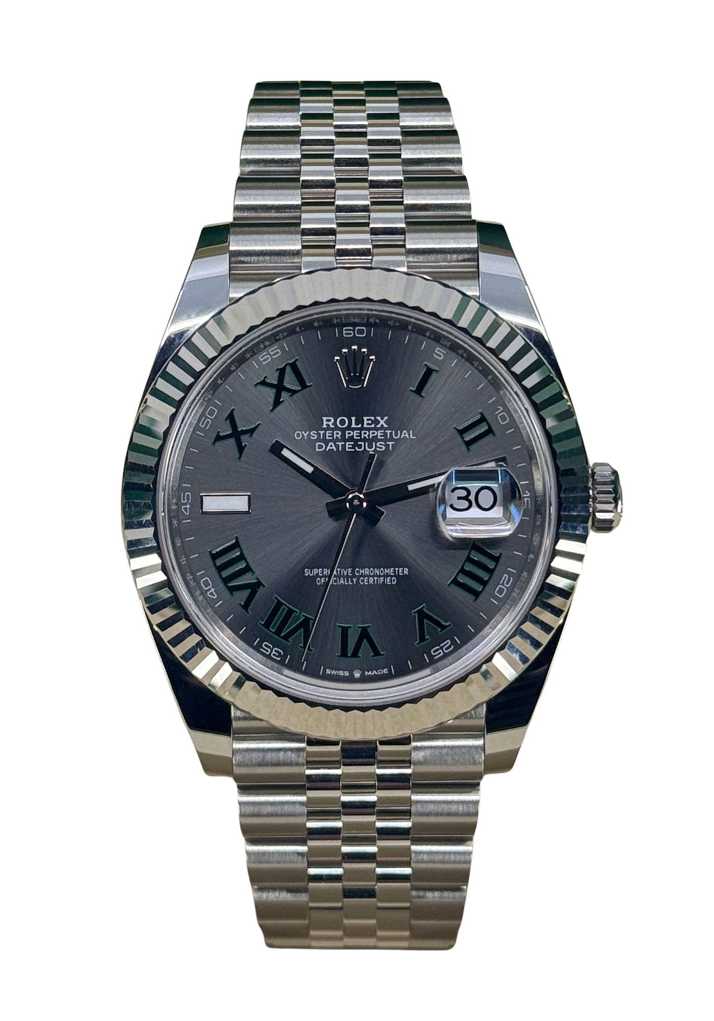 This Rolex Datejust 41 126334 has a slate roman numeral dial and a bracelet strap. This Rolex has undergone a thorough inspection of water resistance, accuracy, functionality and condition to determine the level of reconditioning required to meet our strict standards. It has also been referenced against technical documents and manufacturer records where available to ensure authenticity and a clean history. Our watches have a 24-month warranty for your peace of mind, in conjunction with any remaining manufacturer’s warranty from new or from service. To maintain the manufacturer’s warranty on this watch, it has not been polished in our service centre.