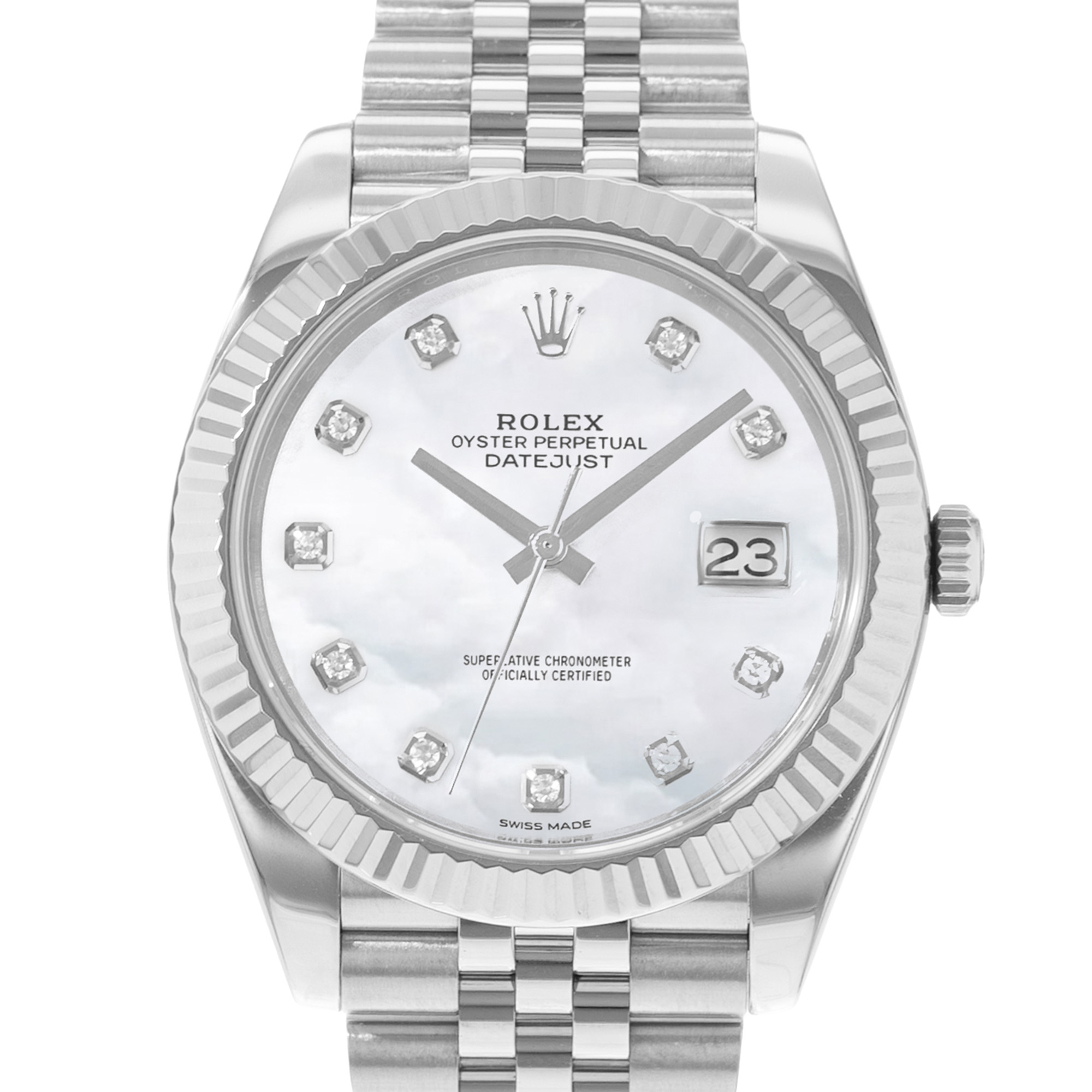 This Rolex Datejust 41 126334 has a mother of pearl white - diamond dial and a bracelet strap. This Rolex has undergone a thorough inspection of water resistance, accuracy, functionality and condition to determine the level of reconditioning required to meet our strict standards. It has also been referenced against technical documents and manufacturer records where available to ensure authenticity and a clean history. All our watches have a 24-month warranty for your peace of mind. One of our skilled polishing technicians has removed marks on the case and bracelet of this watch, brought about by daily wear and tear, which is why this watch does not come with the remaining manufacturer’s warranty.
