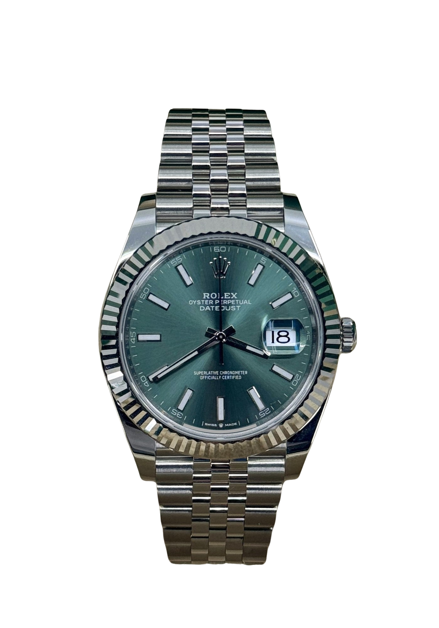 This Rolex Datejust 41 126334 has a mint green baton dial and a bracelet strap. This Rolex has undergone a thorough inspection of water resistance, accuracy, functionality and condition to determine the level of reconditioning required to meet our strict standards. It has also been referenced against technical documents and manufacturer records where available to ensure authenticity and a clean history. Our watches have a 24-month warranty for your peace of mind, in conjunction with any remaining manufacturer’s warranty from new or from service. To maintain the manufacturer’s warranty on this watch, it has not been polished in our service centre.
