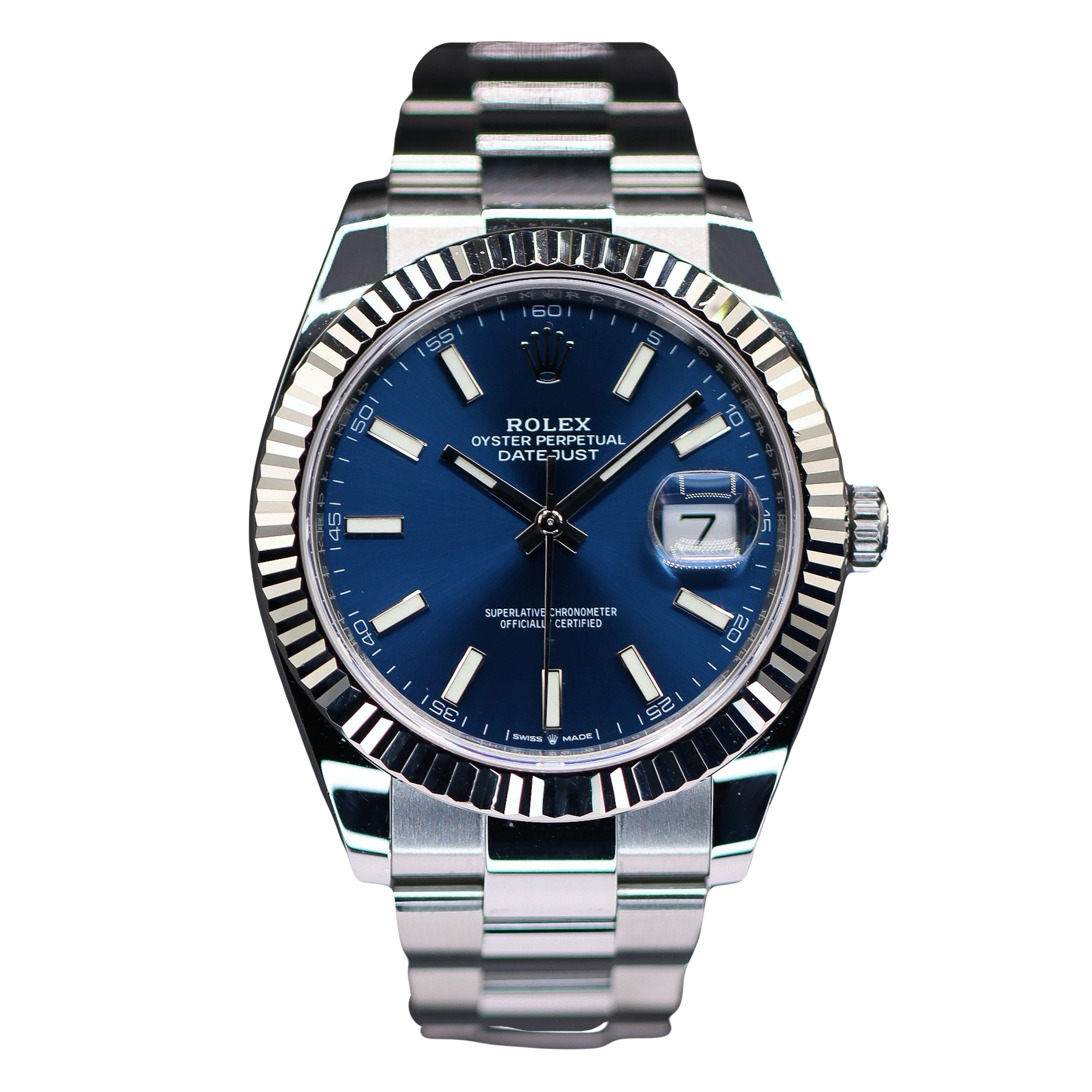 This Rolex Datejust 41 126334 has a blue fluted motif dial and a bracelet strap. This Rolex has undergone a thorough inspection of water resistance, accuracy, functionality and condition to determine the level of reconditioning required to meet our strict standards. It has also been referenced against technical documents and manufacturer records where available to ensure authenticity and a clean history. All our watches have a 24-month warranty for your peace of mind. One of our skilled polishing technicians has removed marks on the case and bracelet of this watch, brought about by daily wear and tear, which is why this watch does not come with the remaining manufacturer’s warranty.