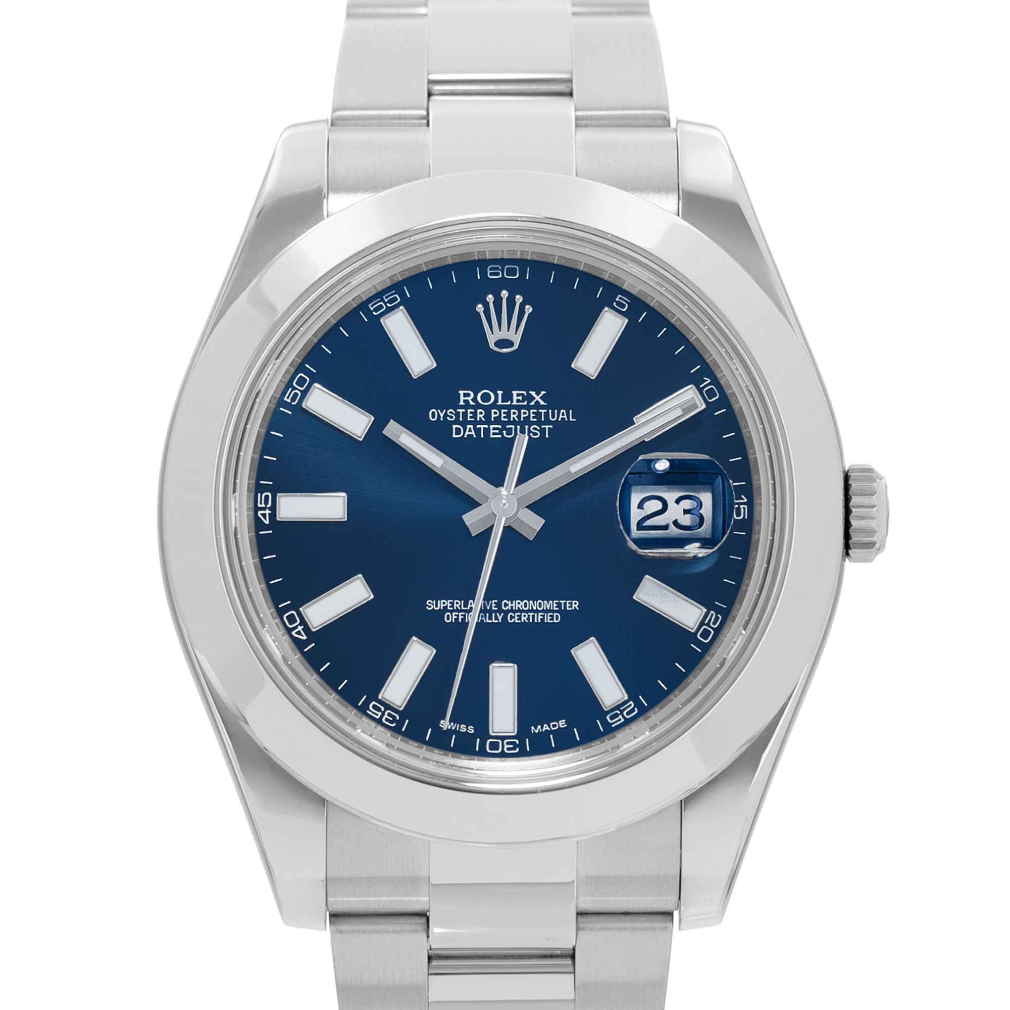 This Rolex Datejust II 116300 has a blue baton dial and a bracelet strap. This Rolex has undergone a thorough inspection of water resistance, accuracy, functionality and condition to determine the level of reconditioning required to meet our strict standards. It has also been referenced against technical documents and manufacturer records where available to ensure authenticity and a clean history. All our watches have a 24-month warranty for your peace of mind. One of our skilled polishing technicians has removed marks on the case and bracelet of this watch, brought about by daily wear and tear, which is why this watch does not come with the remaining manufacturer’s warranty.