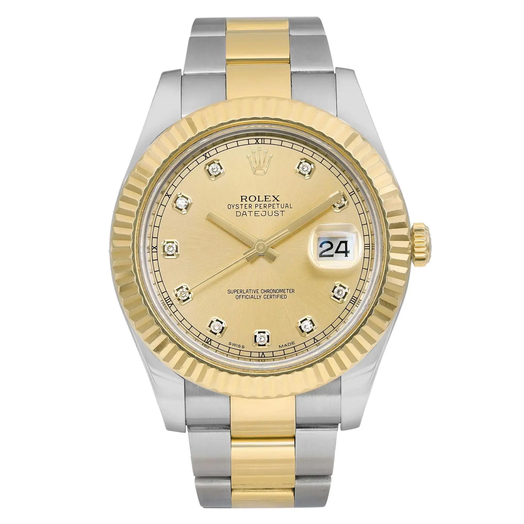 This Rolex Datejust II 116333 has a champagne diamond dial and a bracelet strap. This Rolex has undergone a thorough inspection of water resistance, accuracy, functionality and condition to determine the level of reconditioning required to meet our strict standards. It has also been referenced against technical documents and manufacturer records where available to ensure authenticity and a clean history. All our watches have a 24-month warranty for your peace of mind. One of our skilled polishing technicians has removed marks on the case and bracelet of this watch, brought about by daily wear and tear, which is why this watch does not come with the remaining manufacturer’s warranty.