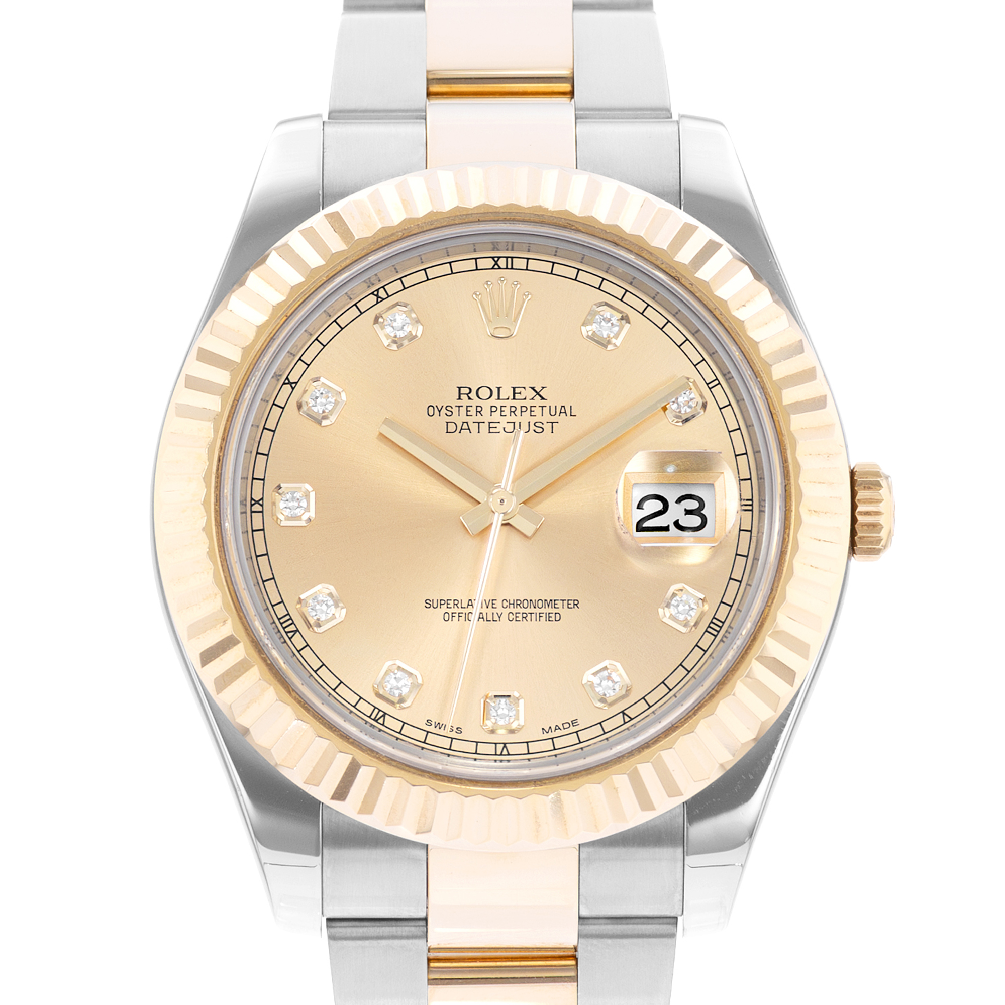 This Rolex Datejust II 116333 has a champagne diamond dial and a bracelet strap. This Rolex has undergone a thorough inspection of water resistance, accuracy, functionality and condition to determine the level of reconditioning required to meet our strict standards. It has also been referenced against technical documents and manufacturer records where available to ensure authenticity and a clean history. All our watches have a 24-month warranty for your peace of mind. One of our skilled polishing technicians has removed marks on the case and bracelet of this watch, brought about by daily wear and tear, which is why this watch does not come with the remaining manufacturer’s warranty.