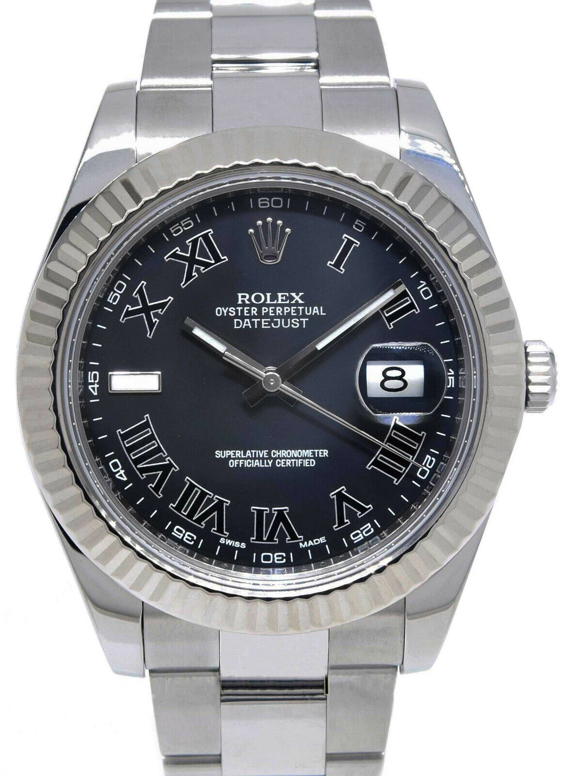 This Rolex Datejust II 116334 has a black roman numeral dial and a bracelet strap. This Rolex has undergone a thorough inspection of water resistance, accuracy, functionality and condition to determine the level of reconditioning required to meet our strict standards. It has also been referenced against technical documents and manufacturer records where available to ensure authenticity and a clean history. All our watches have a 24-month warranty for your peace of mind. One of our skilled polishing technicians has removed marks on the case and bracelet of this watch, brought about by daily wear and tear, which is why this watch does not come with the remaining manufacturer’s warranty.