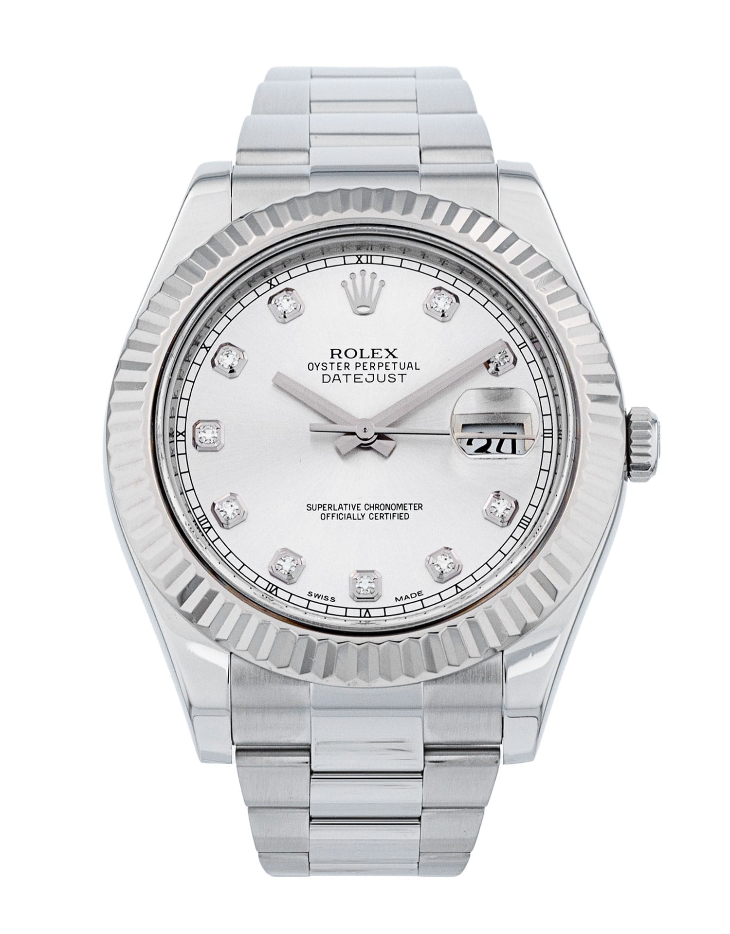 This Rolex Datejust II 116334 has a silver diamond dial and a bracelet strap. This Rolex has undergone a thorough inspection of water resistance, accuracy, functionality and condition to determine the level of reconditioning required to meet our strict standards. It has also been referenced against technical documents and manufacturer records where available to ensure authenticity and a clean history. All our watches have a 24-month warranty for your peace of mind. One of our skilled polishing technicians has removed marks on the case and bracelet of this watch, brought about by daily wear and tear, which is why this watch does not come with the remaining manufacturer’s warranty.