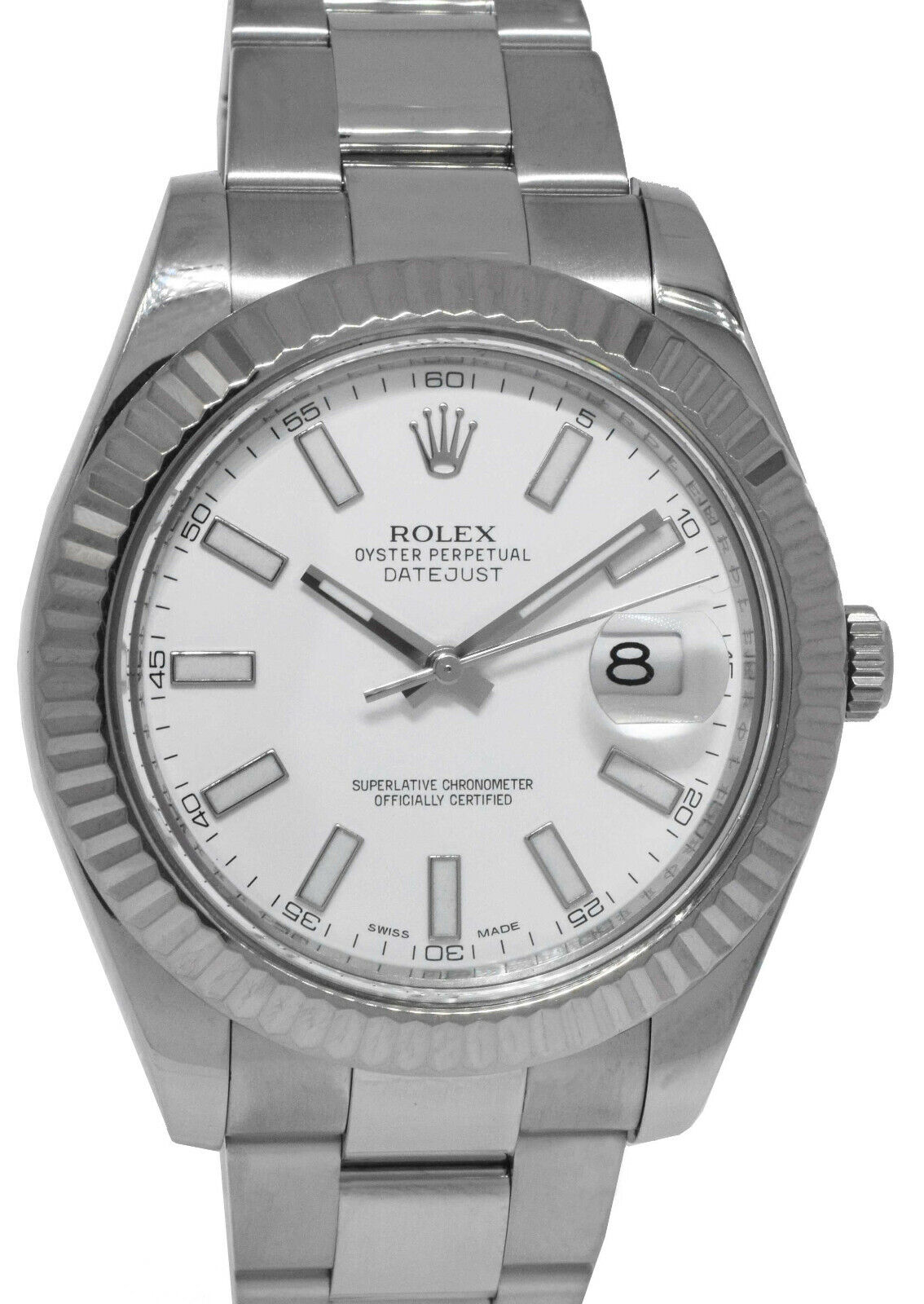 This Rolex Datejust II 116334 has a white baton dial and a bracelet strap. This Rolex has undergone a thorough inspection of water resistance, accuracy, functionality and condition to determine the level of reconditioning required to meet our strict standards. It has also been referenced against technical documents and manufacturer records where available to ensure authenticity and a clean history. All our watches have a 24-month warranty for your peace of mind. One of our skilled polishing technicians has removed marks on the case and bracelet of this watch, brought about by daily wear and tear, which is why this watch does not come with the remaining manufacturer’s warranty.