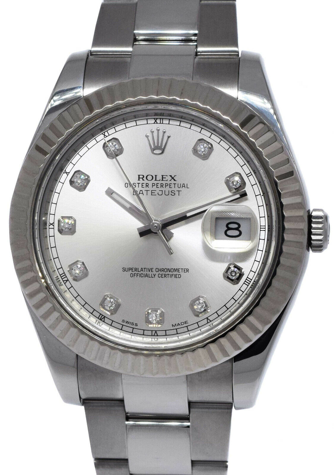 This Rolex Datejust II 116334 has a rhodium diamond dial and a bracelet strap. This Rolex has undergone a thorough inspection of water resistance, accuracy, functionality and condition to determine the level of reconditioning required to meet our strict standards. It has also been referenced against technical documents and manufacturer records where available to ensure authenticity and a clean history. All our watches have a 24-month warranty for your peace of mind. One of our skilled polishing technicians has removed marks on the case and bracelet of this watch, brought about by daily wear and tear, which is why this watch does not come with the remaining manufacturer’s warranty.