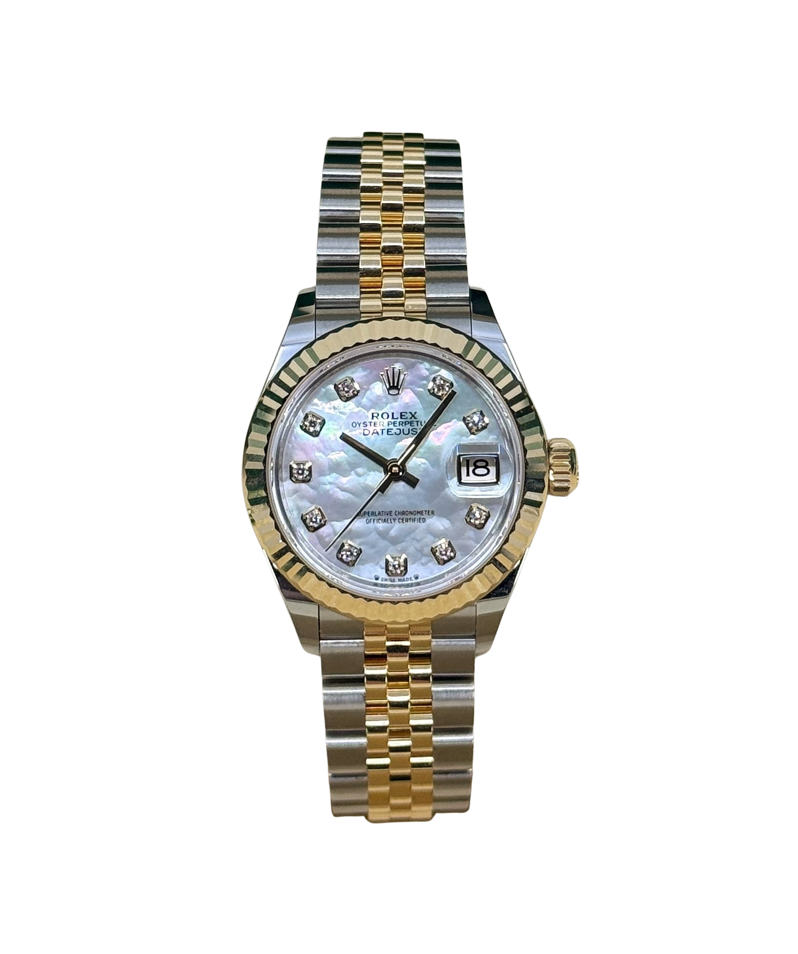 This Rolex Datejust Lady 28 279173 has a mother of pearl white - diamond dial and a bracelet strap. This Rolex has undergone a thorough inspection of water resistance, accuracy, functionality and condition to determine the level of reconditioning required to meet our strict standards. It has also been referenced against technical documents and manufacturer records where available to ensure authenticity and a clean history. Our watches have a 24-month warranty for your peace of mind, in conjunction with any remaining manufacturer’s warranty from new or from service. To maintain the manufacturer’s warranty on this watch, it has not been polished in our service centre.