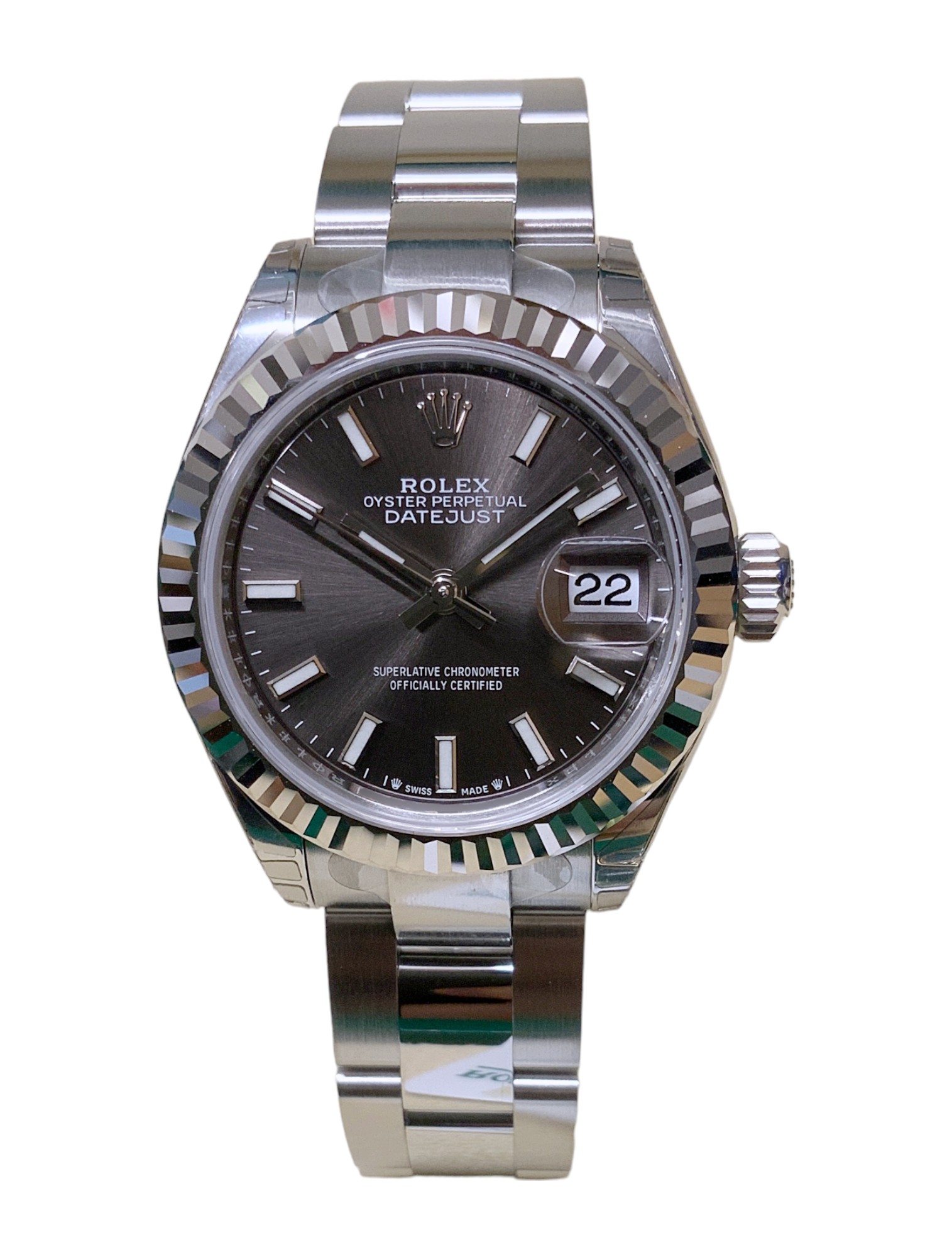 This Rolex Datejust Lady 28 279174 has a dark grey baton dial and a bracelet strap. This Rolex has undergone a thorough inspection of water resistance, accuracy, functionality and condition to determine the level of reconditioning required to meet our strict standards. It has also been referenced against technical documents and manufacturer records where available to ensure authenticity and a clean history. Our watches have a 24-month warranty for your peace of mind, in conjunction with any remaining manufacturer’s warranty from new or from service. To maintain the manufacturer’s warranty on this watch, it has not been polished in our service centre.