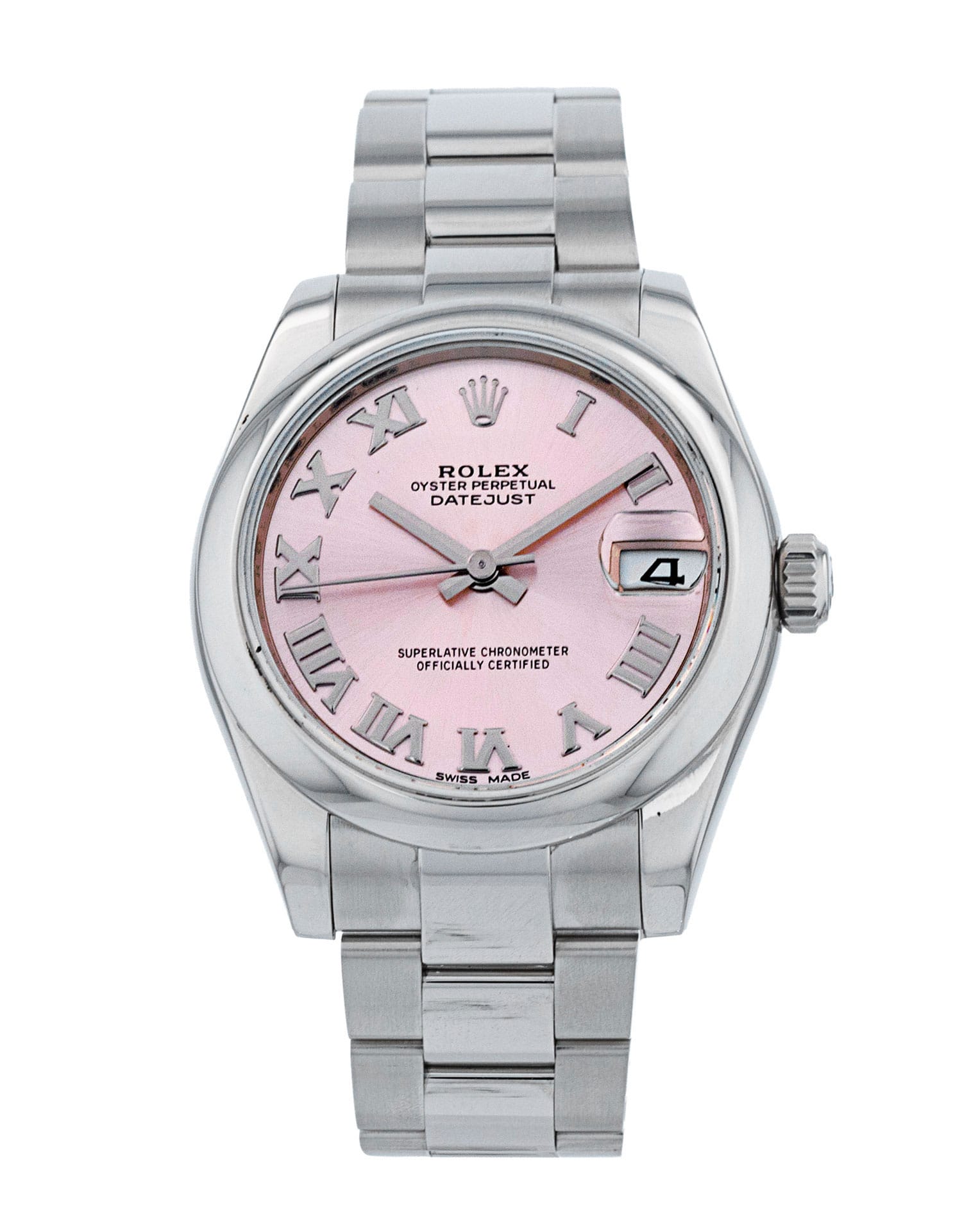 This Rolex Datejust Lady 31 178240 has a pink roman numeral dial and a bracelet strap. This Rolex has undergone a thorough inspection of water resistance, accuracy, functionality and condition to determine the level of reconditioning required to meet our strict standards. It has also been referenced against technical documents and manufacturer records where available to ensure authenticity and a clean history. All our watches have a 24-month warranty for your peace of mind. One of our skilled polishing technicians has removed marks on the case and bracelet of this watch, brought about by daily wear and tear, which is why this watch does not come with the remaining manufacturer’s warranty.