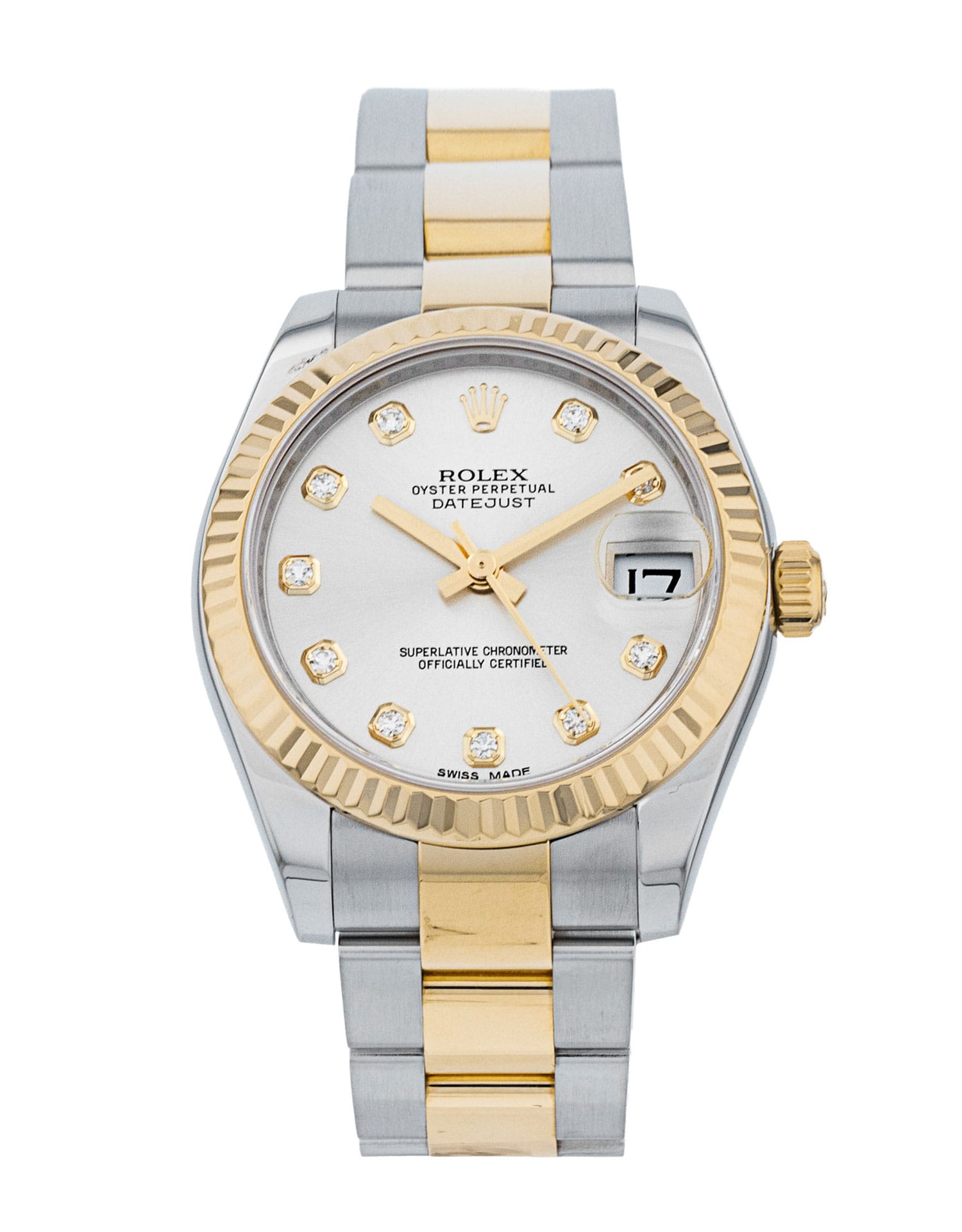 This Rolex Datejust Lady 31 178273 has a silver diamond dial and a bracelet strap. This Rolex has undergone a thorough inspection of water resistance, accuracy, functionality and condition to determine the level of reconditioning required to meet our strict standards. It has also been referenced against technical documents and manufacturer records where available to ensure authenticity and a clean history. All our watches have a 24-month warranty for your peace of mind. One of our skilled polishing technicians has removed marks on the case and bracelet of this watch, brought about by daily wear and tear, which is why this watch does not come with the remaining manufacturer’s warranty.