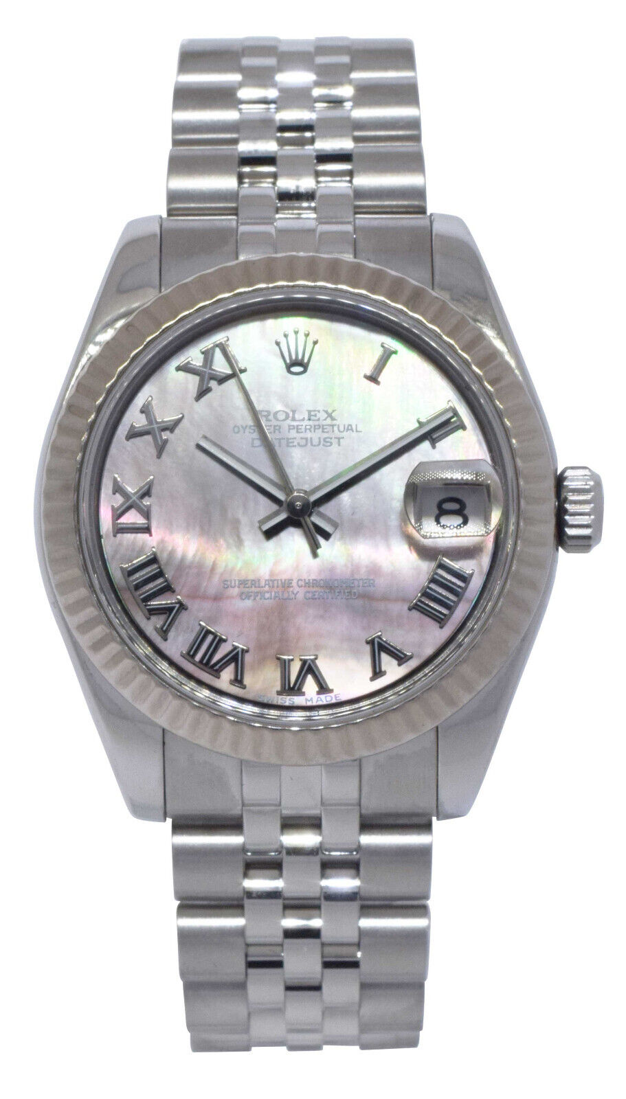 This Rolex Datejust Lady 31 178274 has a mother of pearl white roman numeral diamond dial and a bracelet strap. This Rolex has undergone a thorough inspection of water resistance, accuracy, functionality and condition to determine the level of reconditioning required to meet our strict standards. It has also been referenced against technical documents and manufacturer records where available to ensure authenticity and a clean history. All our watches have a 24-month warranty for your peace of mind. One of our skilled polishing technicians has removed marks on the case and bracelet of this watch, brought about by daily wear and tear, which is why this watch does not come with the remaining manufacturer’s warranty.