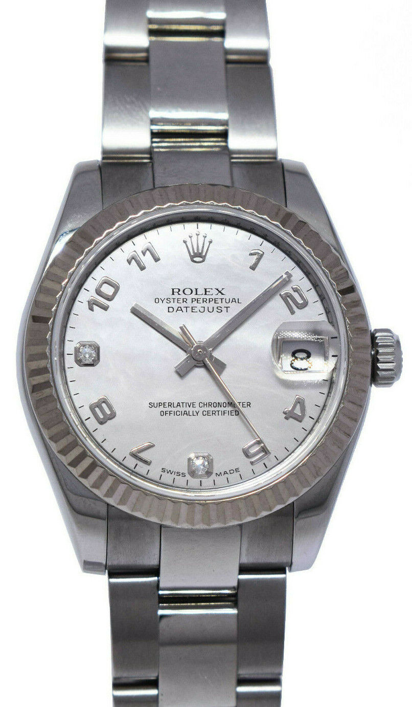 This Rolex Datejust Lady 31 178274 has a silver concentric arabic dial and a bracelet strap. This Rolex has undergone a thorough inspection of water resistance, accuracy, functionality and condition to determine the level of reconditioning required to meet our strict standards. It has also been referenced against technical documents and manufacturer records where available to ensure authenticity and a clean history. All our watches have a 24-month warranty for your peace of mind. One of our skilled polishing technicians has removed marks on the case and bracelet of this watch, brought about by daily wear and tear, which is why this watch does not come with the remaining manufacturer’s warranty.