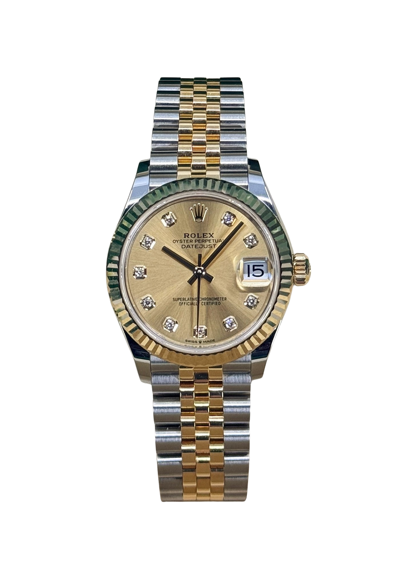 This Rolex Datejust Lady 31 278273 has a champagne diamond dial and a bracelet strap. This Rolex has undergone a thorough inspection of water resistance, accuracy, functionality and condition to determine the level of reconditioning required to meet our strict standards. It has also been referenced against technical documents and manufacturer records where available to ensure authenticity and a clean history. Our watches have a 24-month warranty for your peace of mind, in conjunction with any remaining manufacturer’s warranty from new or from service. To maintain the manufacturer’s warranty on this watch, it has not been polished in our service centre.