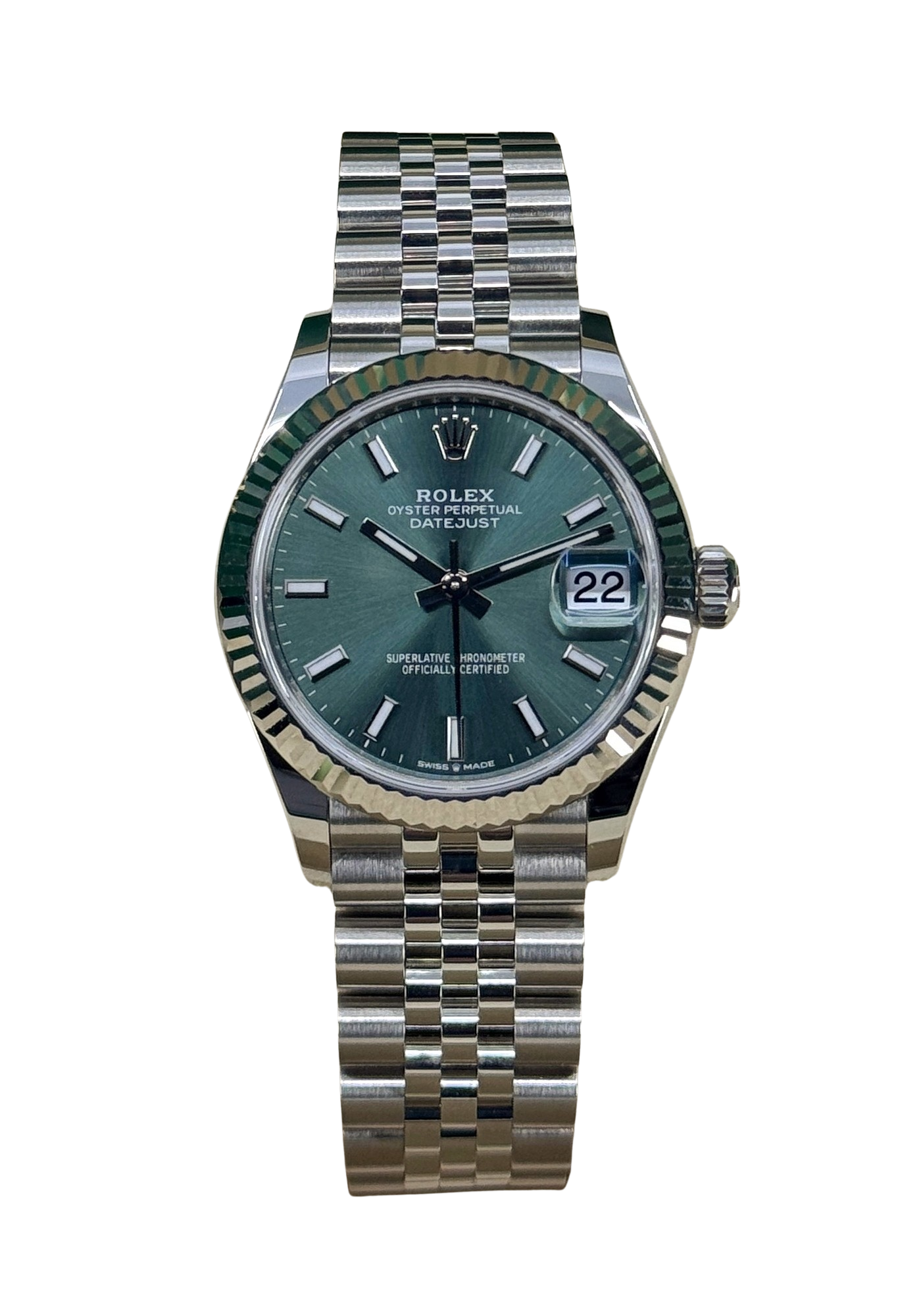 This Rolex Datejust Lady 31 278274 has a green baton dial and a bracelet strap. This Rolex has undergone a thorough inspection of water resistance, accuracy, functionality and condition to determine the level of reconditioning required to meet our strict standards. It has also been referenced against technical documents and manufacturer records where available to ensure authenticity and a clean history. Our watches have a 24-month warranty for your peace of mind, in conjunction with any remaining manufacturer’s warranty from new or from service. To maintain the manufacturer’s warranty on this watch, it has not been polished in our service centre.