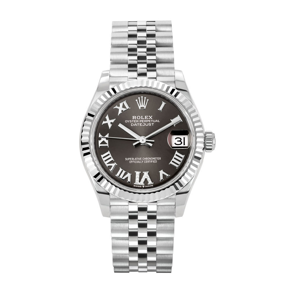 This Rolex Datejust Lady 31 278274 has a dark grey roman numeral diamond dial and a bracelet strap. This Rolex has undergone a thorough inspection of water resistance, accuracy, functionality and condition to determine the level of reconditioning required to meet our strict standards. It has also been referenced against technical documents and manufacturer records where available to ensure authenticity and a clean history. Our watches have a 24-month warranty for your peace of mind, in conjunction with any remaining manufacturer’s warranty from new or from service. To maintain the manufacturer’s warranty on this watch, it has not been polished in our service centre.