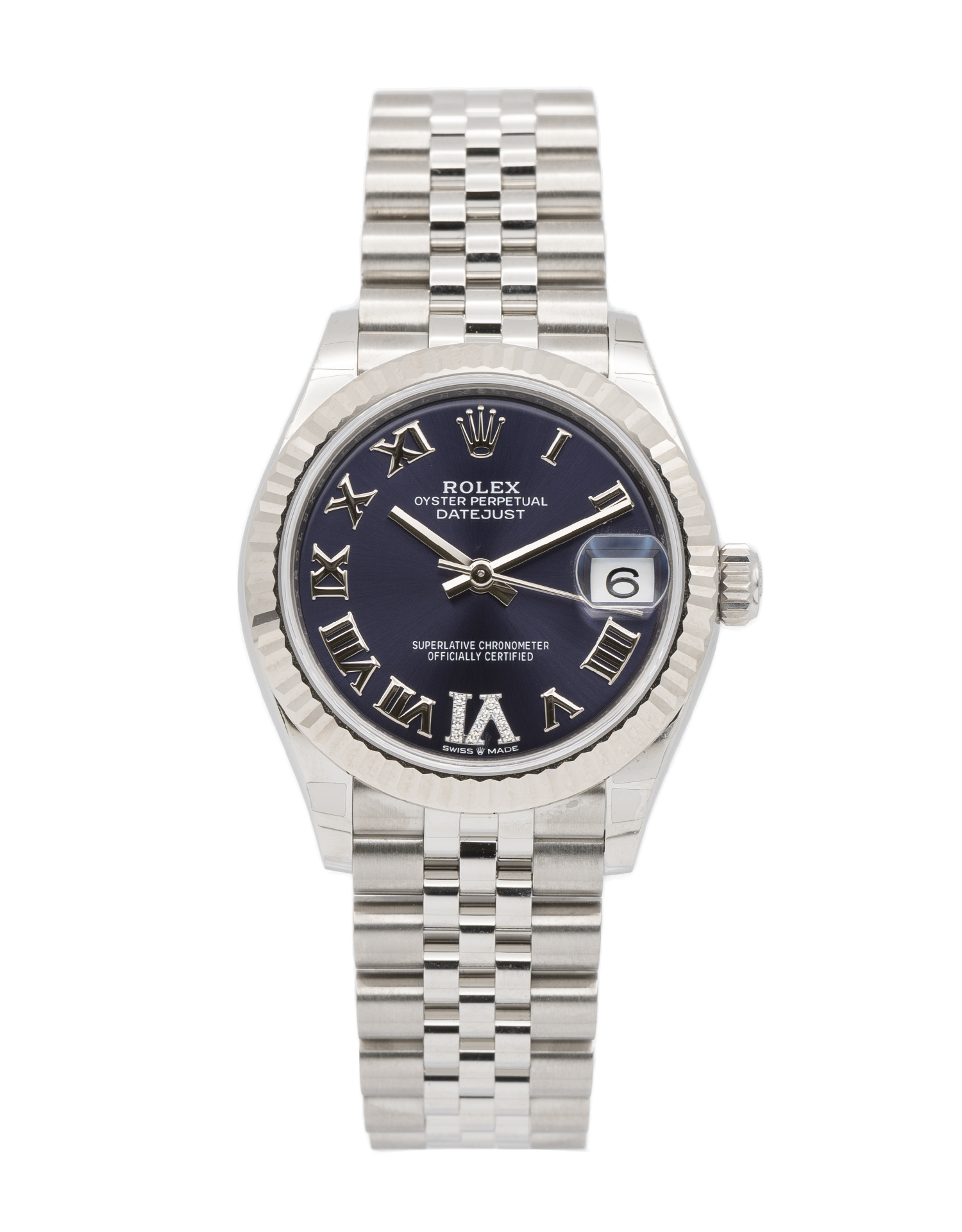 This Rolex Datejust Lady 31 278274 has a aubergine roman numeral diamond dial and a bracelet strap. This Rolex has undergone a thorough inspection of water resistance, accuracy, functionality and condition to determine the level of reconditioning required to meet our strict standards. It has also been referenced against technical documents and manufacturer records where available to ensure authenticity and a clean history. Our watches have a 24-month warranty for your peace of mind, in conjunction with any remaining manufacturer’s warranty from new or from service. To maintain the manufacturer’s warranty on this watch, it has not been polished in our service centre.