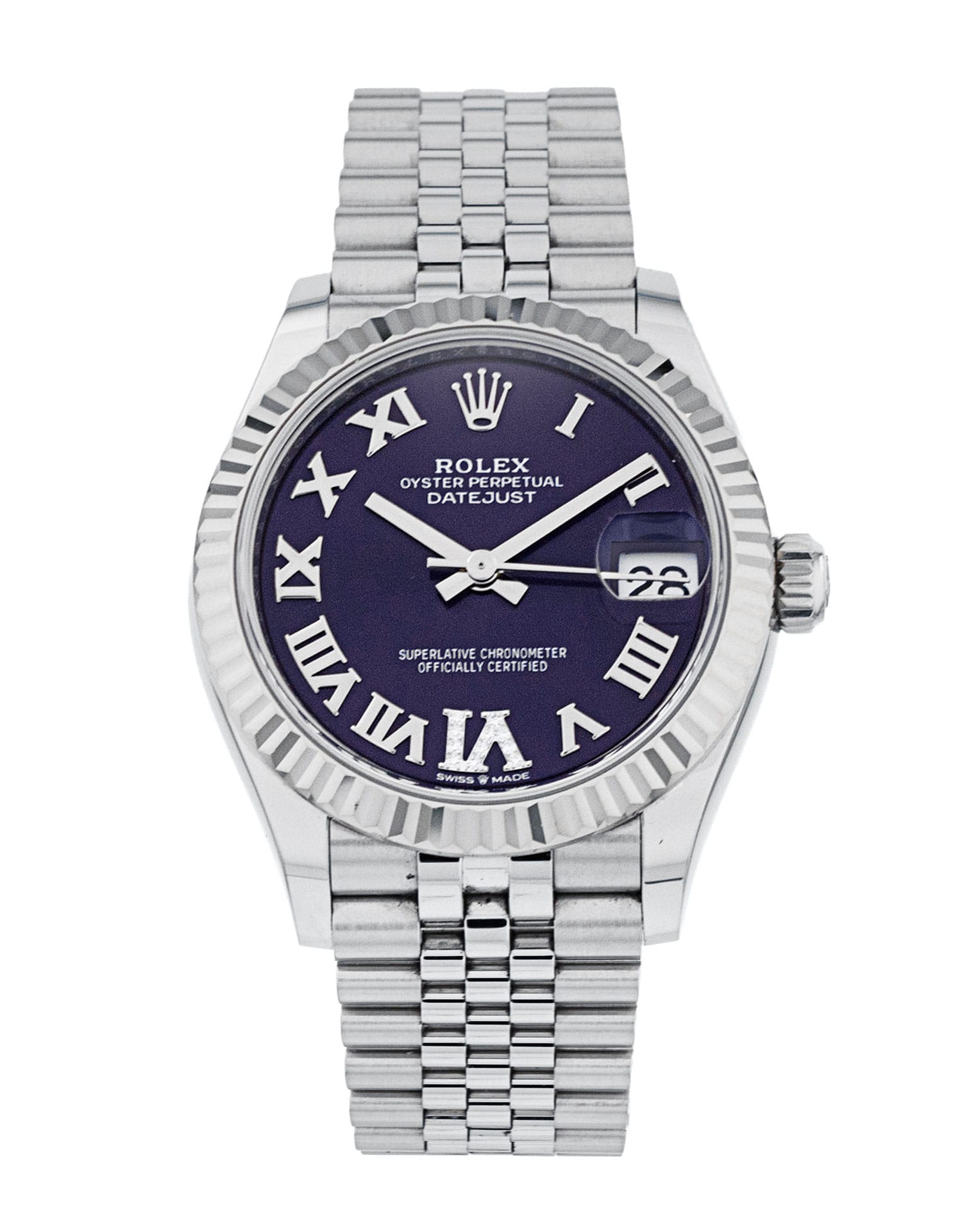 This Rolex Datejust Lady 31 278274 has a aubergine roman numeral diamond dial and a bracelet strap. This Rolex has undergone a thorough inspection of water resistance, accuracy, functionality and condition to determine the level of reconditioning required to meet our strict standards. It has also been referenced against technical documents and manufacturer records where available to ensure authenticity and a clean history. Our watches have a 24-month warranty for your peace of mind, in conjunction with any remaining manufacturer’s warranty from new or from service. To maintain the manufacturer’s warranty on this watch, it has not been polished in our service centre.