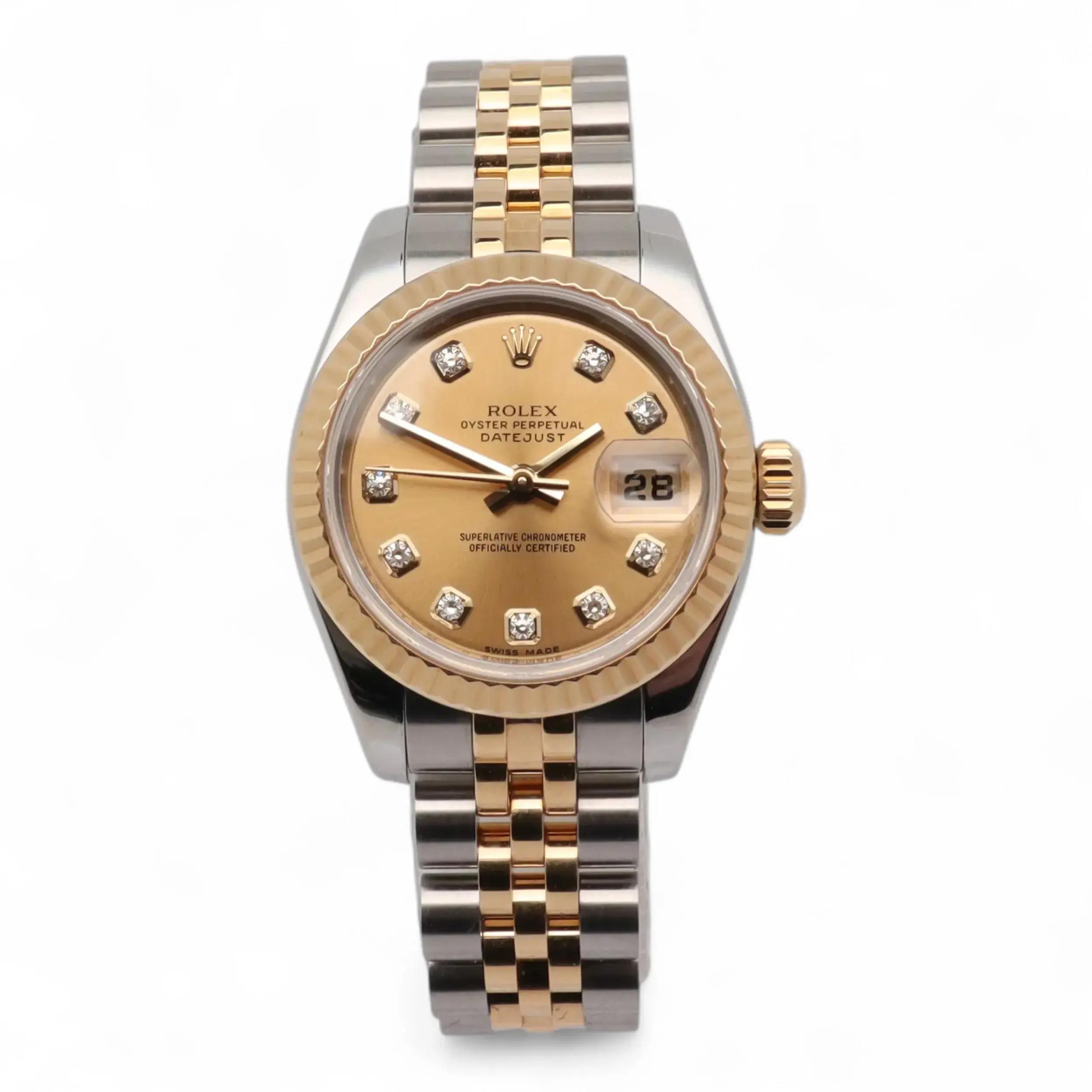 This Rolex Datejust Lady 179173 has a champagne diamond dial and a bracelet strap. This Rolex has undergone a thorough inspection of water resistance, accuracy, functionality and condition to determine the level of reconditioning required to meet our strict standards. It has also been referenced against technical documents and manufacturer records where available to ensure authenticity and a clean history. All our watches have a 24-month warranty for your peace of mind. One of our skilled polishing technicians has removed marks on the case and bracelet of this watch, brought about by daily wear and tear, which is why this watch does not come with the remaining manufacturer’s warranty.