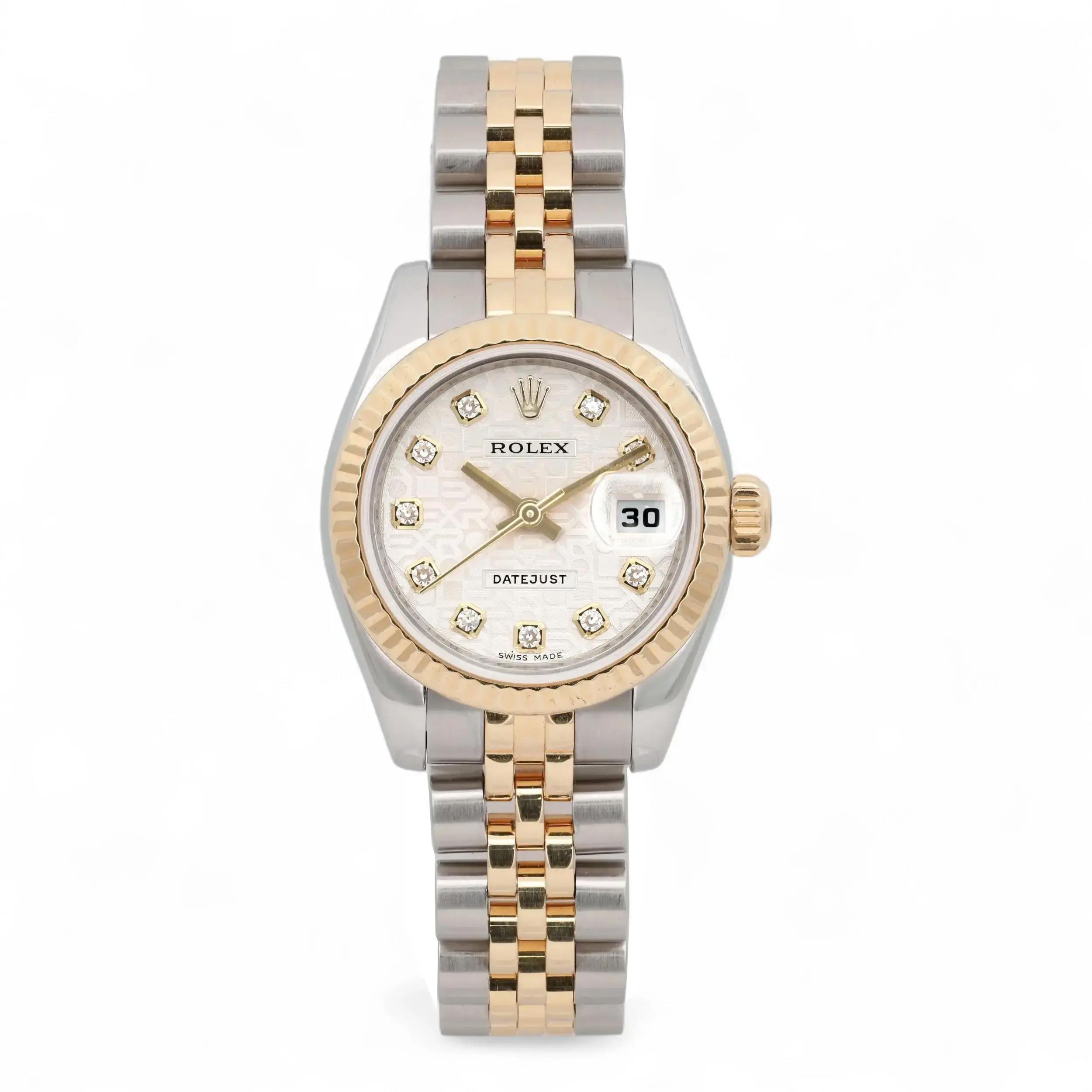 This Rolex Datejust Lady 179173 has a silver diamond dial and a bracelet strap. This Rolex has undergone a thorough inspection of water resistance, accuracy, functionality and condition to determine the level of reconditioning required to meet our strict standards. It has also been referenced against technical documents and manufacturer records where available to ensure authenticity and a clean history. All our watches have a 24-month warranty for your peace of mind. One of our skilled polishing technicians has removed marks on the case and bracelet of this watch, brought about by daily wear and tear, which is why this watch does not come with the remaining manufacturer’s warranty.